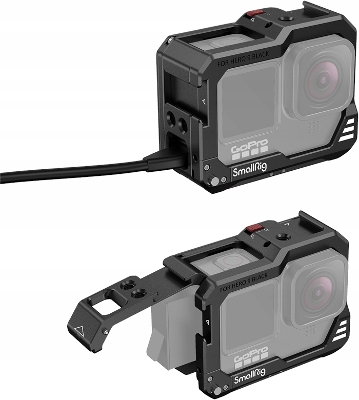 SmallRig GoPro Hero 10/9 Black Camera Cage 3084 створений для захисту вашої камери, має кілька кріплень для аксесуарів і сумісний з мікрофонними адаптерами. Клітка підтримує заміну лінз і сумісна з модом лінз Max. Клітка замикається натисканням на кришку і звільняється натисканням кнопки. У верхній і правій сторонах є два кріплення холодного башмака, які можна підключити до таких аксесуарів, як мікрофони та світлодіодні лампи. Нижня частина містить складне кріплення GoPro, сумісне з оригінальною базовою пластиною GoPro, а різьбовий отвір 1/4 також можна безпосередньо підключити до штатива. На бічній панелі можна швидко розблокувати перемикачі батарей. Камеру можна заряджати через порт USB-C, не відкриваючи панель.