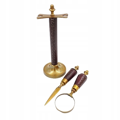 Запрошую придбати набір, що складається з рамки, лупи та різака для паперу. Ручки шкіряні, лезо тверде, металеві частини латунь, набір гарно виглядає.