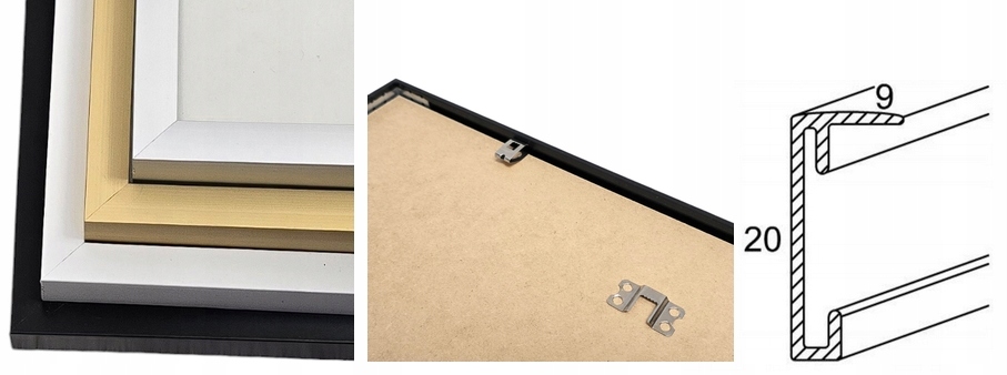 Кожна рама виготовлена з алюмінію, доступна в одному з чотирьох кольорів: чорному, білому, сріблястому, золотому. Рама має профіль 9х20 мм. Рамка без інструментів (із затискачами на звороті), рамку можна повісити на стіну на спеціальному тримачі.