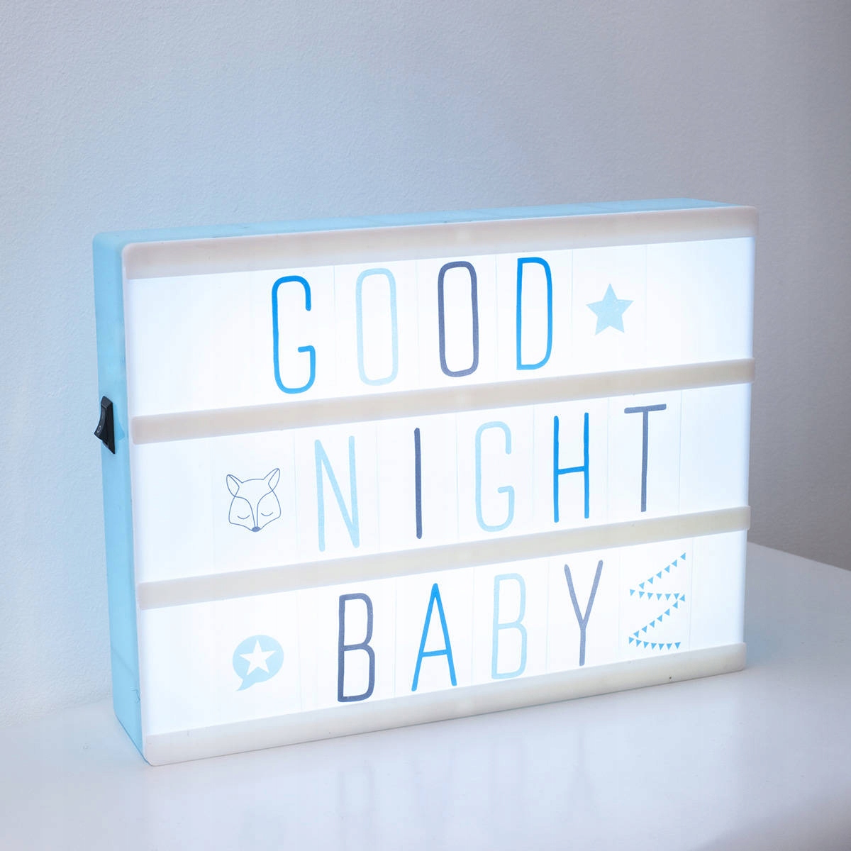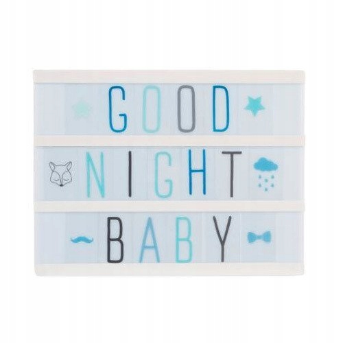 Рамка з підсвічуванням для дитячої кімнати з безліччю функцій - це не тільки чудова прикраса, але, перш за все, гаджет, який дозволить вам провести багато приємних моментів зі своєю дитиною. Оправа має приглушений синій колір. Його розміри 20х15 см, як аркуш паперу А5. Прикріплені картки з літерами та символами можна скомпонувати у різні слова та речення. Чудова підтримка для раннього навчання грамоти. Рамку також можна використовувати як місце для обміну різними повідомленнями з дитиною. Символи також дозволять кодувати інформацію, що буде дуже цікаво навіть для трохи старших дітей. Вони також можуть оцінити рамку як «нагадування» про різні події або справи. Підсвічування дозволяє також використовувати дошку як нічник. Рамка живиться від трьох батарейок АА.