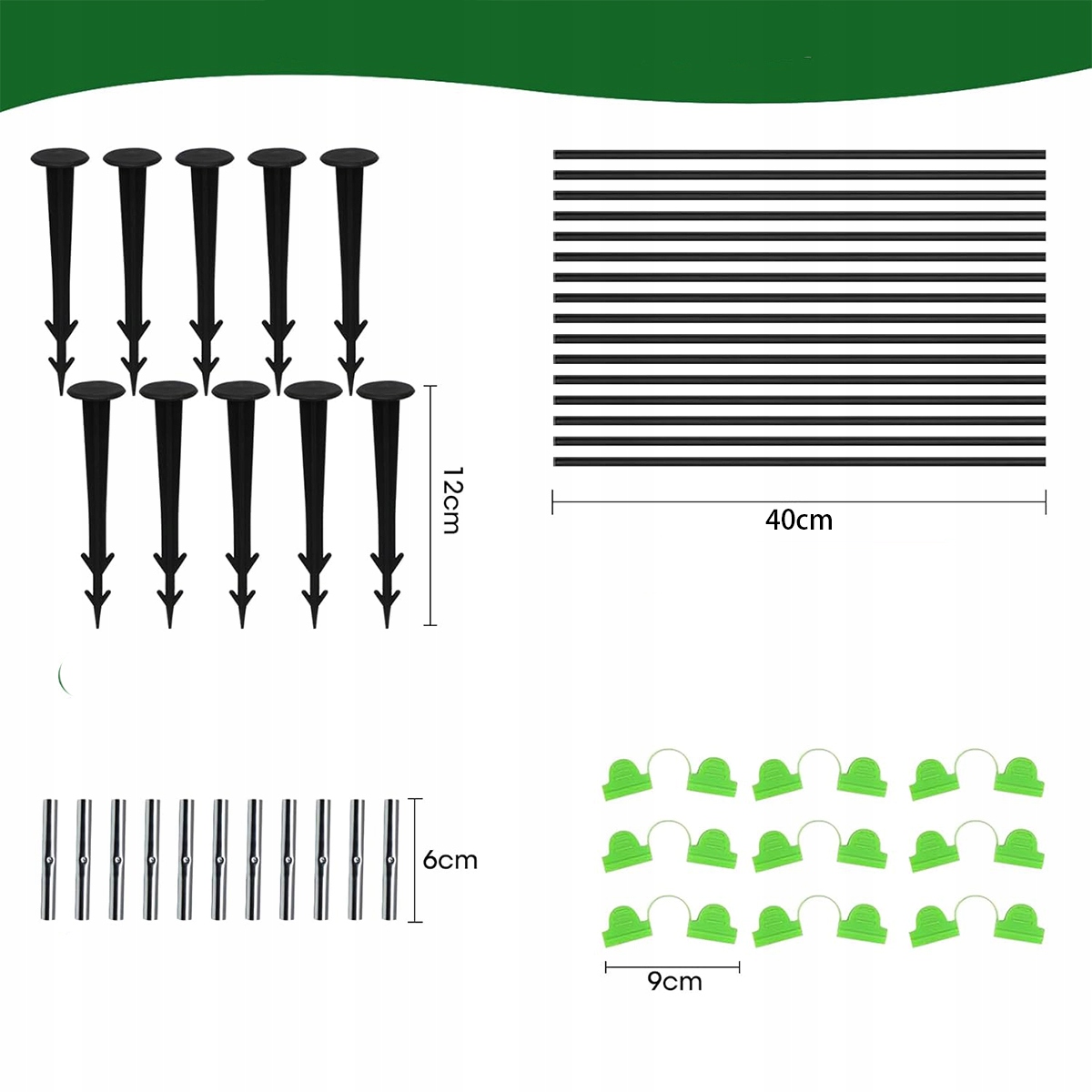 Пакет містить 36 пластикових тунельних дуг великого діаметру та довжиною 40 см, які підходять для грядок шириною від 60 до 110 см, 30 заглушок, 18 садових затискачів та 10 анкерів. Поєднуючи 6 частин, заводський тунель може мати прибл. 82 см (Ш) x 41 см (В), ідеально підходить як тунельна арка для наборів грядок і каркасів садових арок.