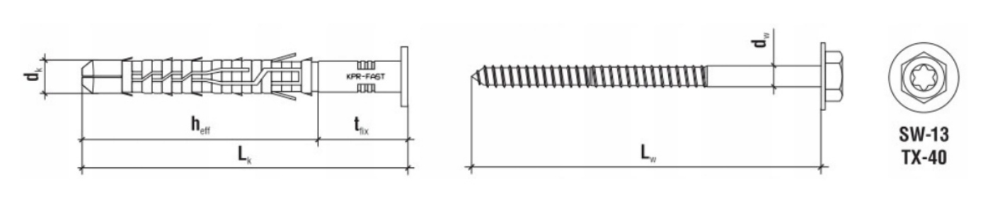 Дюбелі рамні з шестигранною головкою та торцевою головкою Torx KPR-FAST-K 12x200 мм (25 шт.)