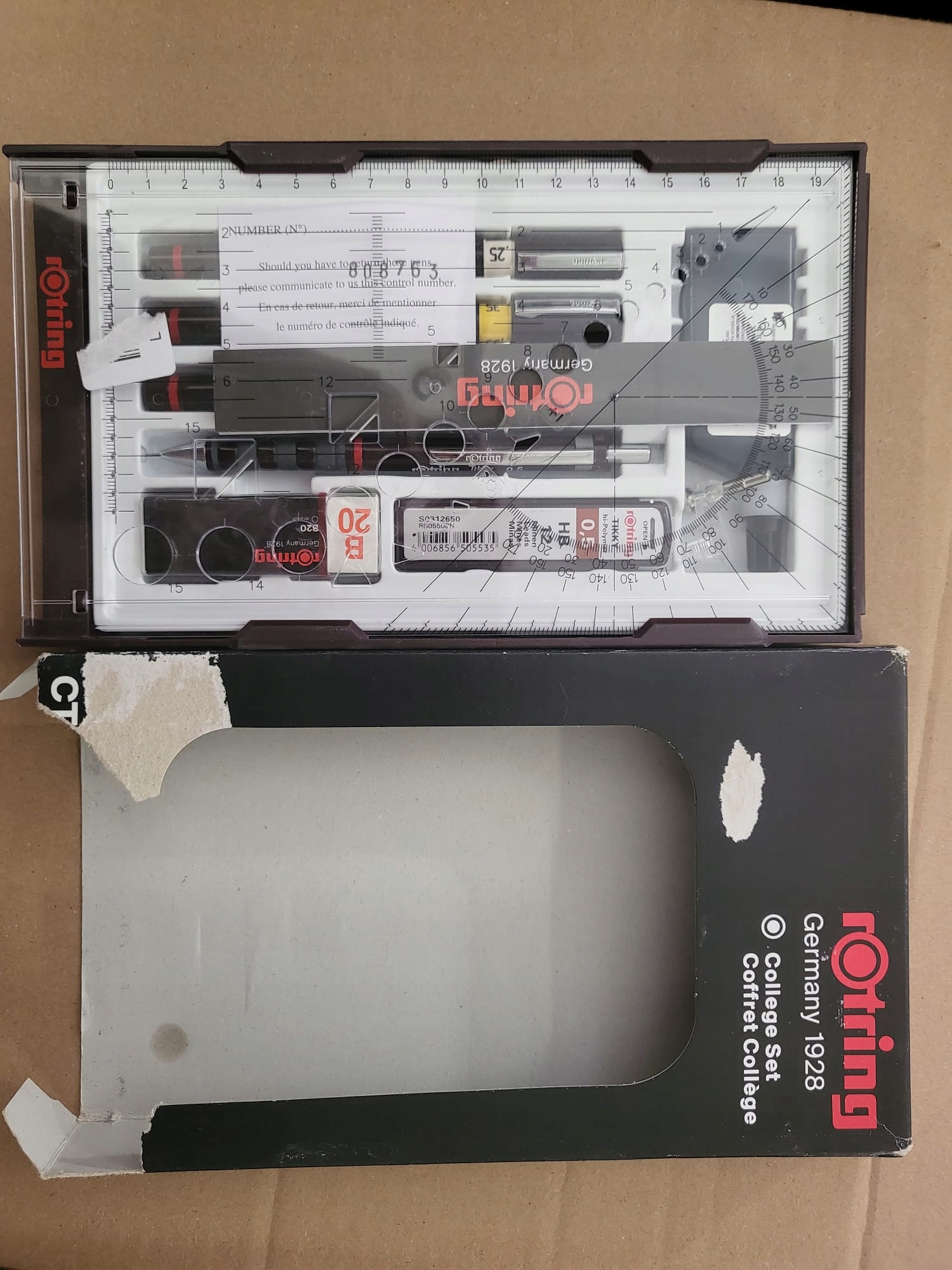 Набір ізографів з механічним олівцем, графітами, гумкою, шаблоном для малювання та чорнильницею.