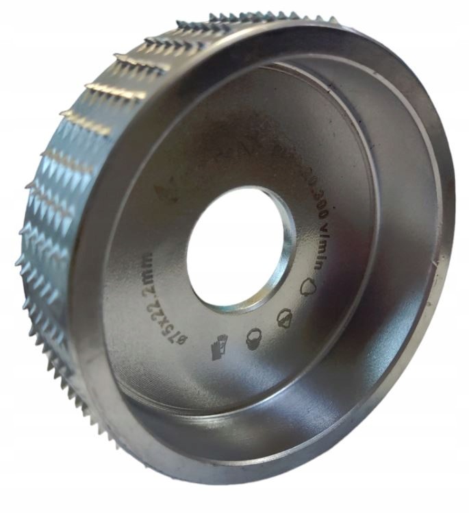 Диск для шліфування деревини у вигляді рашпіля. Діаметр 75 мм дозволяє використовувати інструмент з кутовою шліфувальною машиною. Рашпіль з великою кількістю зубців дозволяє швидко зачищати і шліфувати оброблену поверхню. Зуби розміщені на бічній кромці, що дозволяє виконувати точну обробку в пазах. Сучасна конструкція з трьома зубами, розроблена спеціально для роботи з кутовими шліфувальними машинами, що працюють на високих обертах. Диск також добре працюватиме при формуванні деревини. Його можна використовувати для фрезерування, шліфування, виконання художніх робіт, ліплення, видалення старих лакофарбових покриттів. Дуже агресивна робоча поверхня. Шліфувальний диск - рашпіль виготовлений зі сталі з гострими кінцями, що важливо при більших навантаженнях. Конструкція ріжучих ножів не дозволить їх пошкодити, тому що вони «ховаються» при ударі об камінь або іншу тверду перешкоду. Завдяки цьому ми можемо бути впевнені в тривалій і безвідмовній роботі.