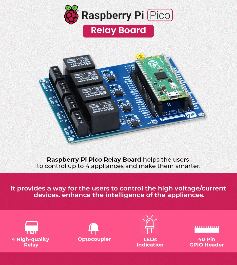 Плата розширення з 4 реле для Raspberry Pi Pico. Забезпечує керування до 4 пристроїв і навантаження до 240 В змінного струму при 7 A, 30 В постійного струму при 10 A. Дозволяє керувати високовольтними пристроями. Він має оптоізолятори, які запобігають впливу високої напруги в одній частині схеми на іншу частину схеми.