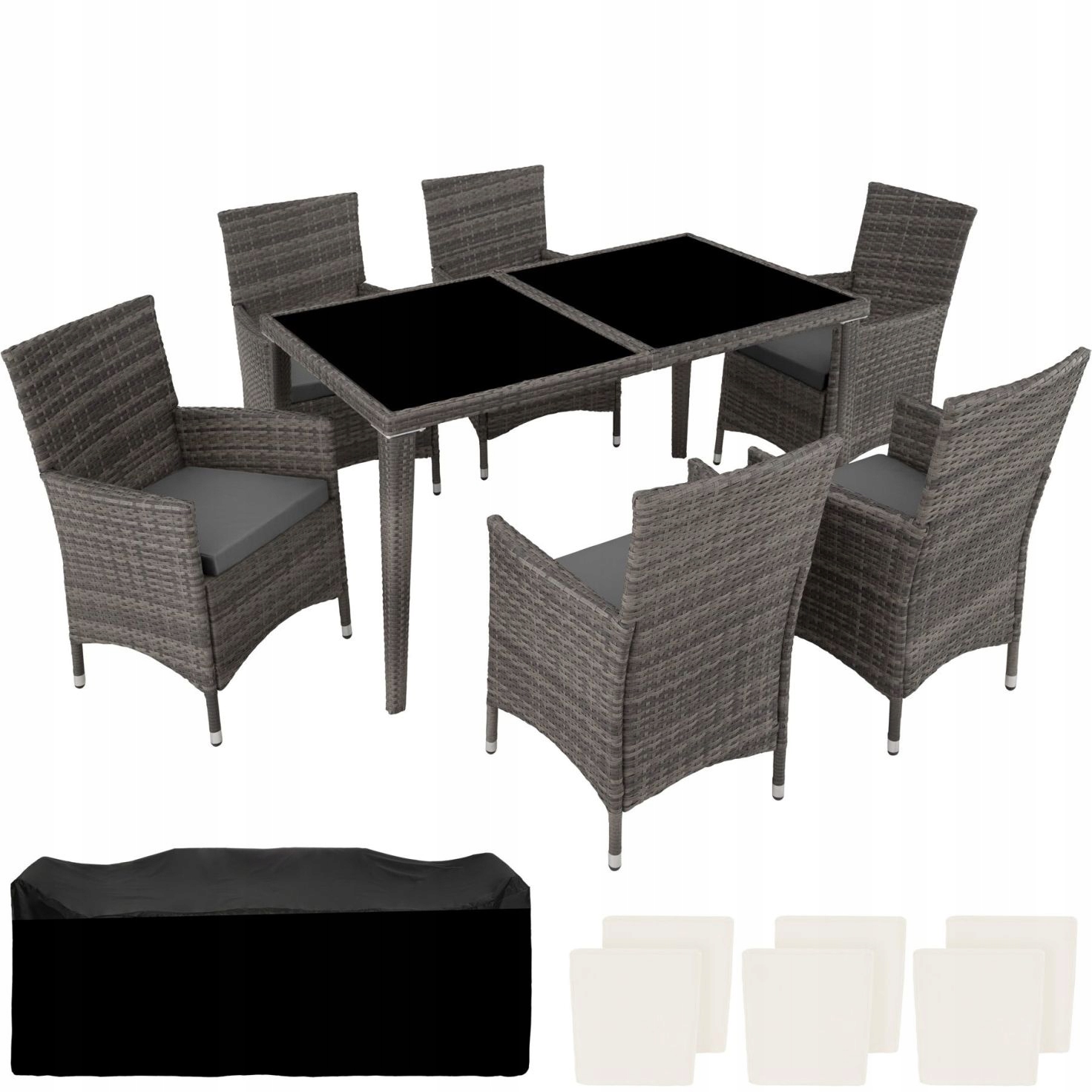 Представлений набір меблів Technorattan має універсальне використання і є справжньою прикрасою саду, тераси, зимового саду чи вітальні. Зручні стільці та елегантний стіл спонукають вас проводити час з родиною чи друзями. Поліція встановлювала не лише елегантний вигляд, але й тривалий період використання. Поверхня столу з 2 темними скляними елементами виглядає стильно і легко зберегти чистоту. Дуже зручні поліестерні подушки ідеально відповідають кольору з меблями з ротанга, а чохли мають блискавку на спині, тому їх можна легко зняти та очистити. Просочена поверхня захищає подушки від шліфування. Завдяки просоченню вони стійкі до бруду та вологи. Набір також включає дощову кришку.