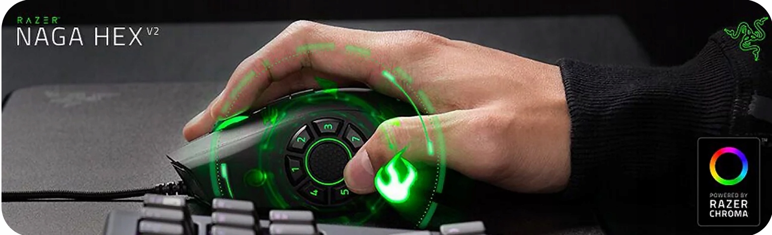 Миша Razer Naga Hex V2, розроблена з урахуванням гравців MOBA, має коліщатко з 7 механічними кнопками, розташованими так, щоб уникнути випадкових натискань. Коліщатко сконструйовано так, що його кнопки розташовані на однаковій відстані від великого пальця. Усі кнопки програмуються та забезпечують швидкий доступ до багатьох команд. Посередині коліщатка для великого пальця є гумова рукоятка для великого пальця, яка забезпечує міцне захоплення миші, незамінна для швидких рухів убік, необхідних в іграх MOBA.
