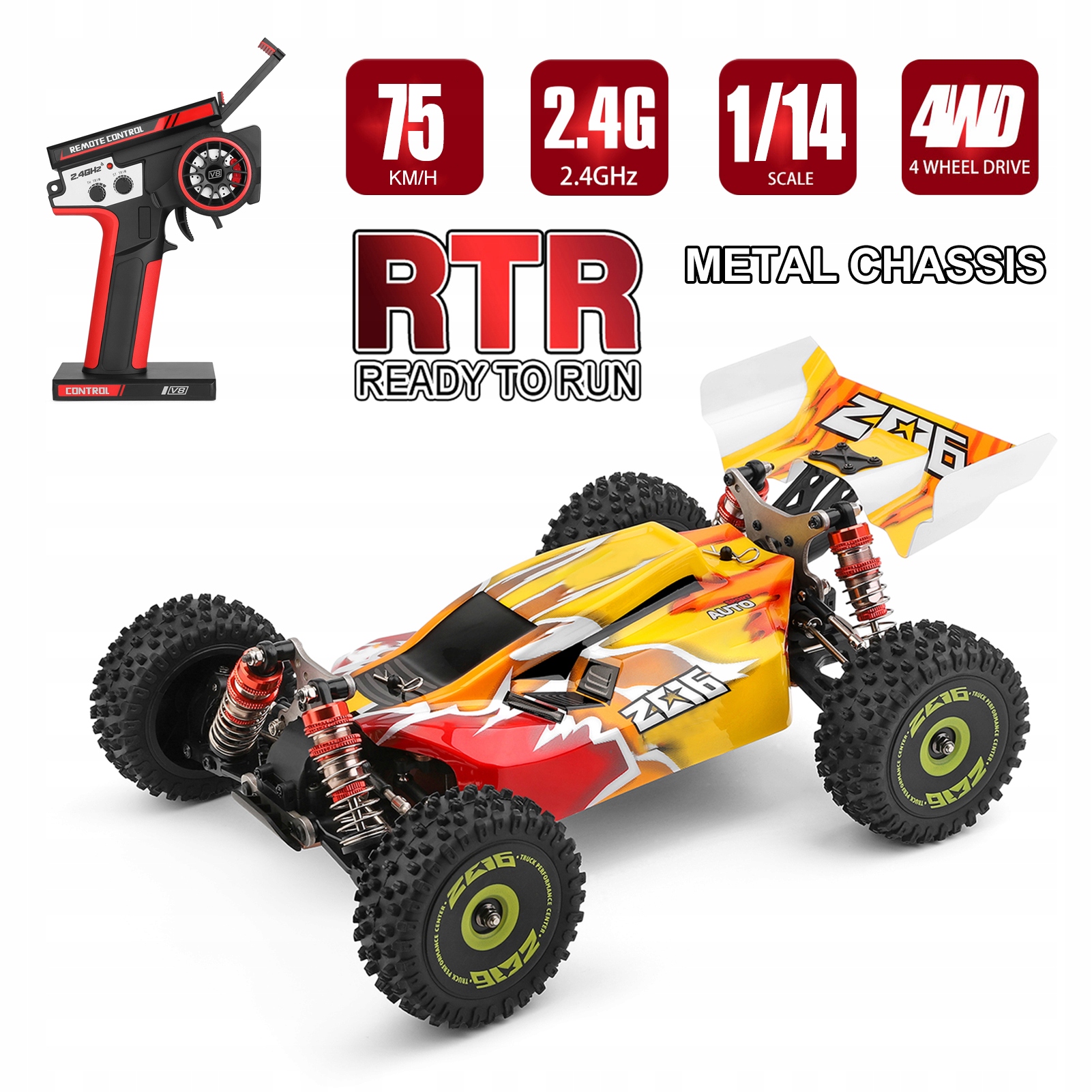 оснащена системою управління 2,4 ГГц, приємним друкованим корпусом, металевим амортитом, міцним безщірним двигуном та акумулятором високої ємності забезпечують гнучкий, стабільний водіння з великою швидкістю, забезпечуючи при цьому довше термін експлуатації. Цей популярний автомобіль може забезпечити відмінне відчуття контролю та реалістичний досвід водіння.