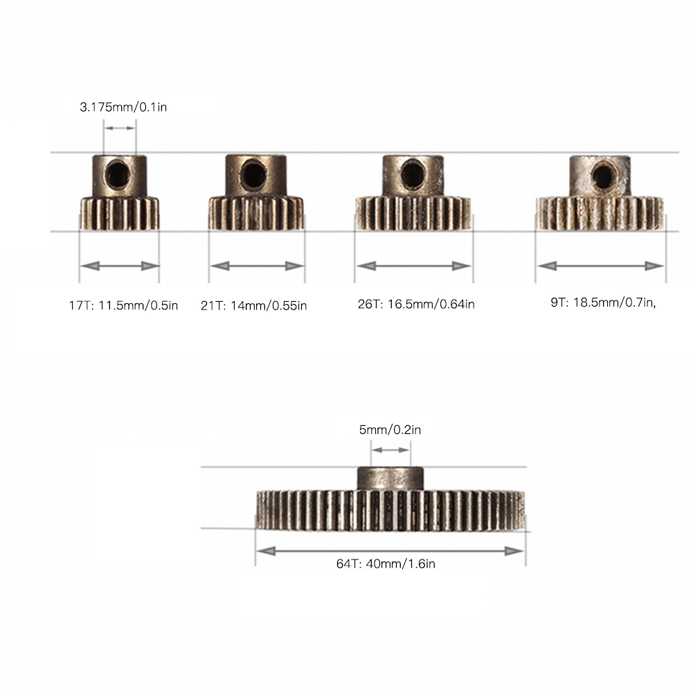 Відповідний діаметр осі: прибл. 3,175 мм/0,1 дюйма (передача двигуна), близько 5 мм/0,2 дюйма (основна передача)