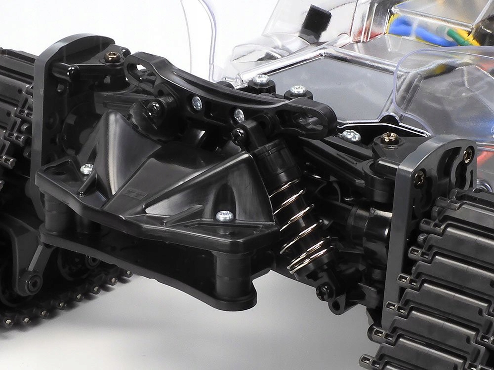 Landfreeder Quadtrack – це нова частина в веселий світ дистанційних моделей Tamiya. У комплекті використовується новий варіант шасі TT-02 із гусеницями в трьох площинах замість коліс: результатом є неймовірне зчеплення, яке можна використовувати для подолання нерівностей. Крім того, кузов з лексану (полікарбонату) вже пофарбований у чорний колір Tamiya PS-5 і має тоновані вікна (Tamiya PS-31 Smoke).