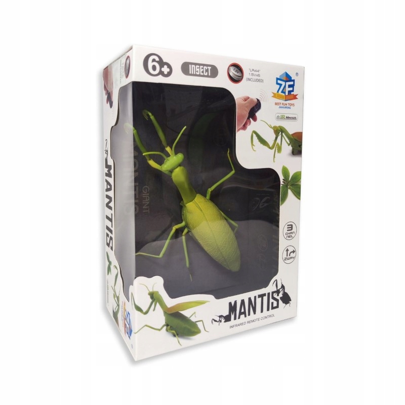 віддалений -керований богомол, який рухається і світить. Мантіс рухається вперед, назад, набік. Набір також включає контролер. Іграшка вимагає 3 x LR44 акумулятора, вони є частиною набору, контролер вимагає 3 x LR44 акумулятор, вони є частиною набору. Інфрачервоний, контролер діапазон до 8 метрів, ігровий час 20 хв. Підходить для дітей від 6 років.