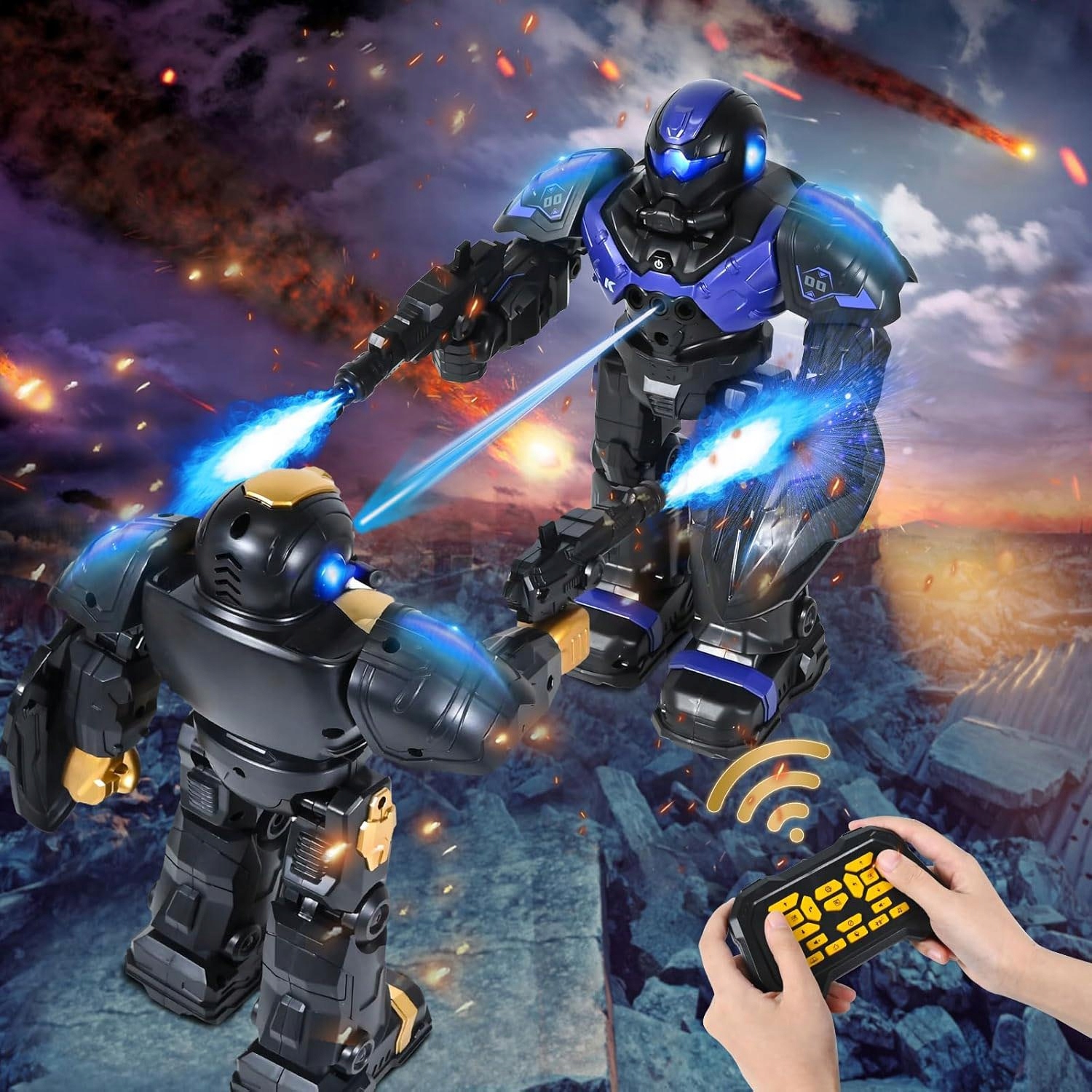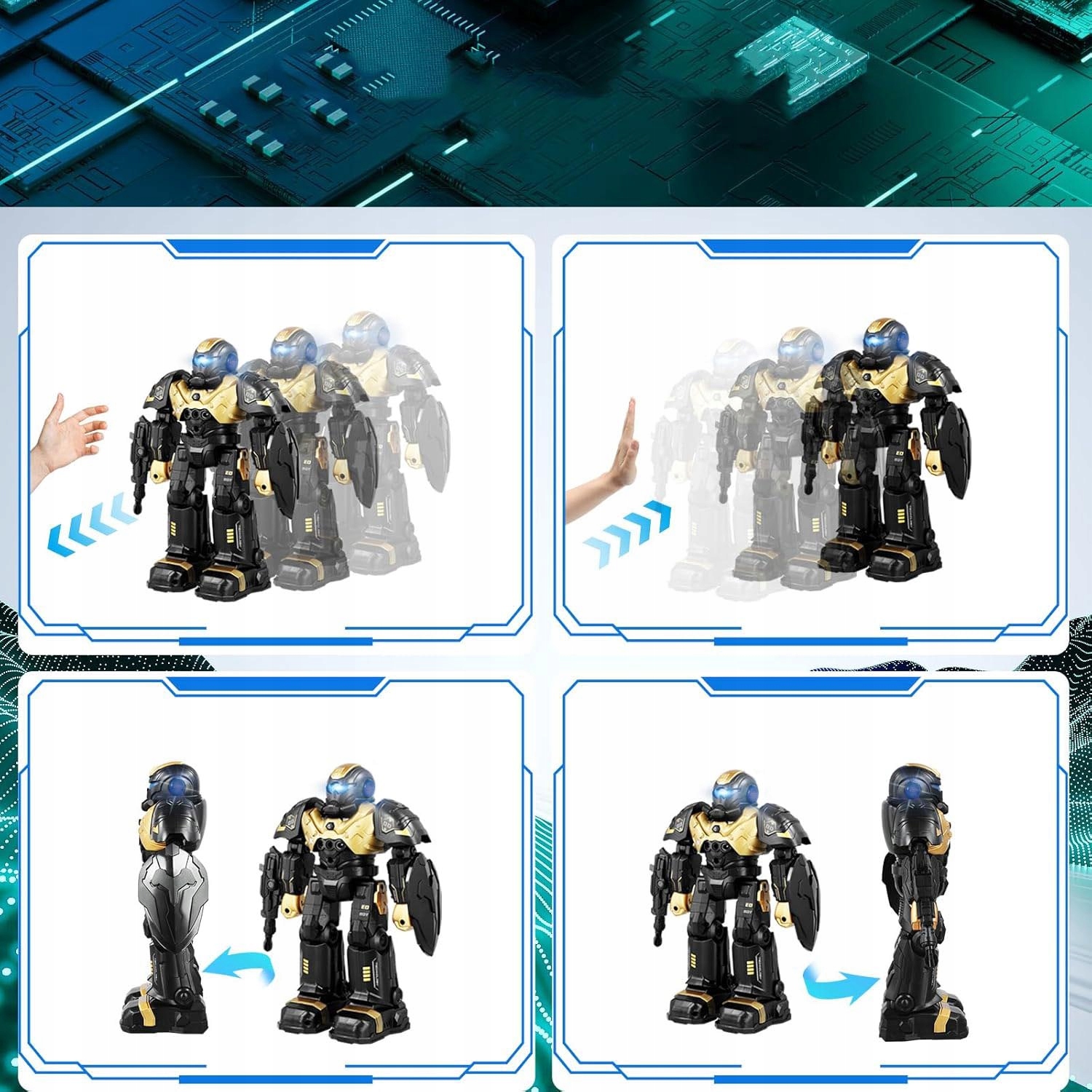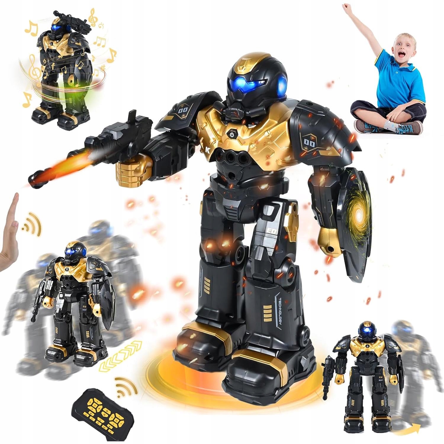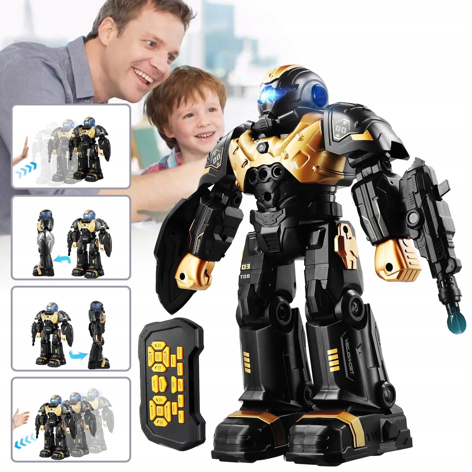 Робот із дистанційним керуванням постачається з дистанційним керуванням, щитом, пістолетом і кулями. Робот більший за інших роботів і імітує звук кулемета. Отже, якщо обидва діти купують цього робота, вони зможуть влаштувати захоплюючий бій! Робот також має світлодіодні очі, що дуже круто вночі, і дітям дуже сподобається ця іграшка!
