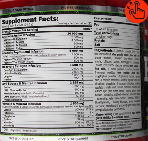 - Містить пептиди лейцину та триптофану (Pep-Form™)® – гарантує найвищий рівень засвоєння амінокислот на ринку. Технологія недоступна в більшості конкурентоспроможних продуктів