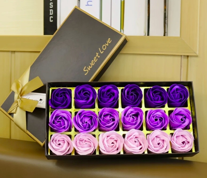 Róże mydlane komplet 18 sztuk w kolorze fioletowym w pudełku