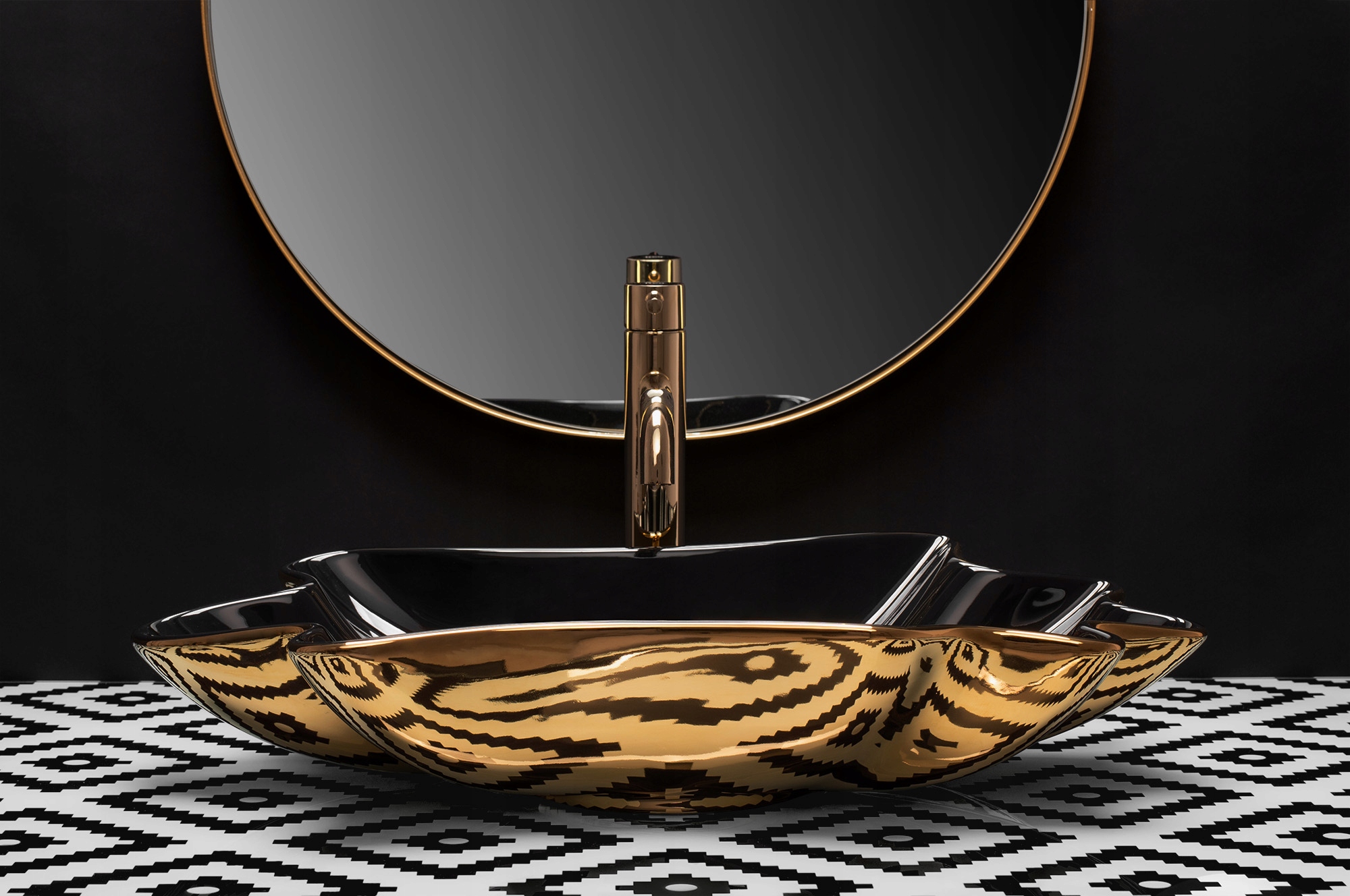 ⚜ стільниця нескінченної стільниці вражає не лише своєю функціональністю, але, перш за все, незвичайною конструкцією . Нерегулярна, хвиляста форма робить її основною точкою кожної сучасної ванної кімнати. Контрастна комбінація золотого та чорного кольору дає вишуканість мийки та унікальну чарівність