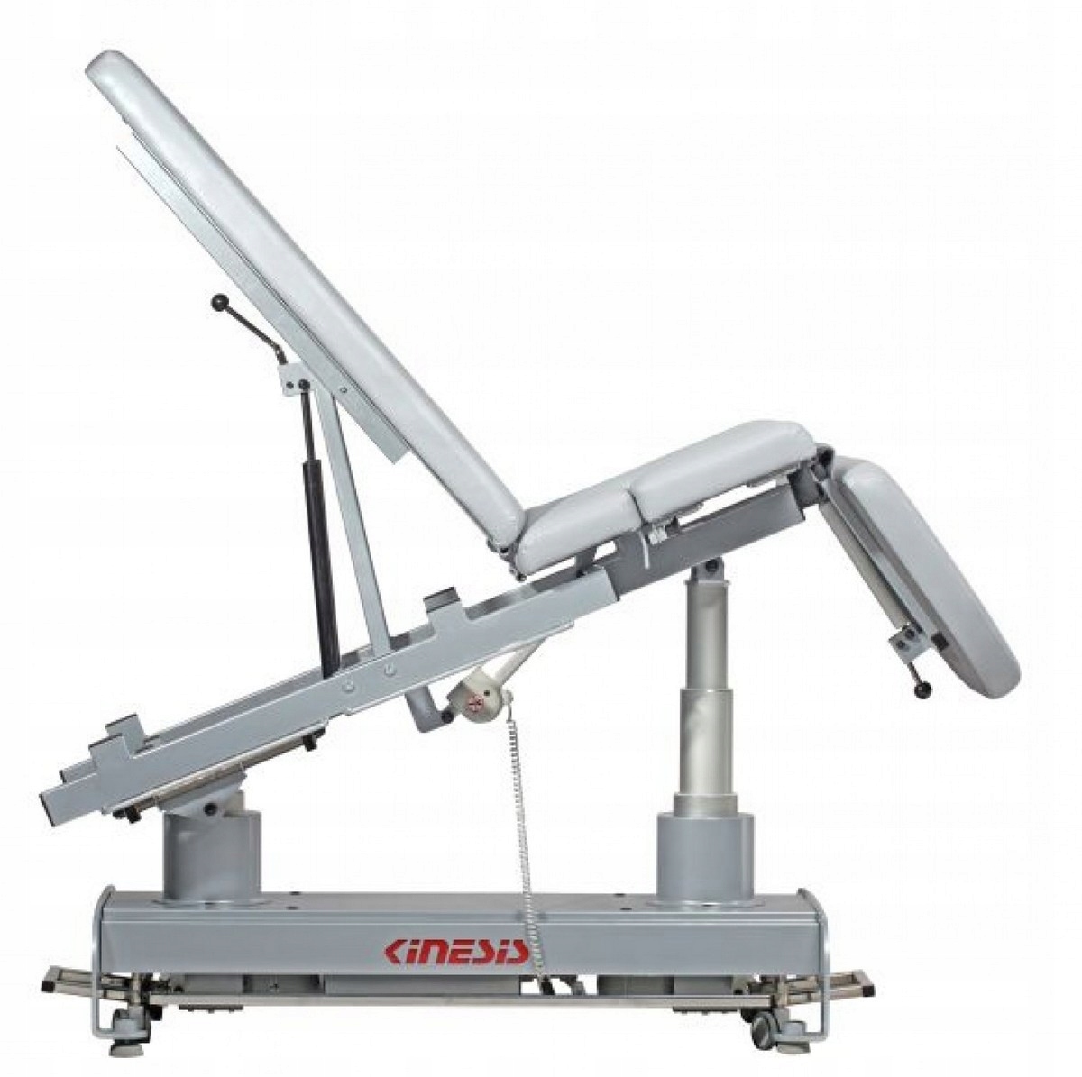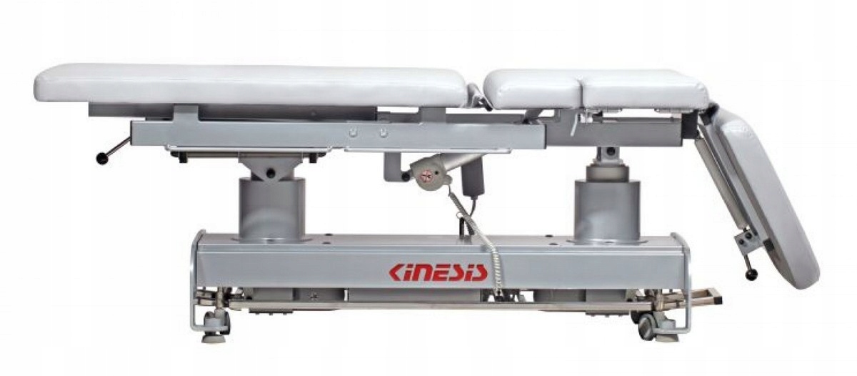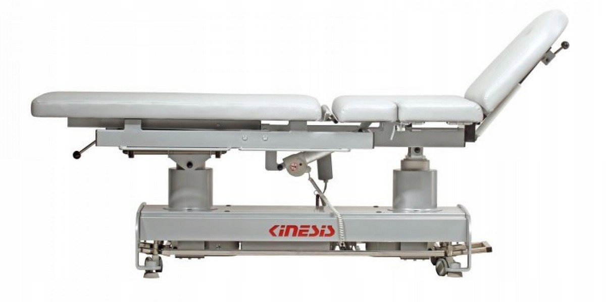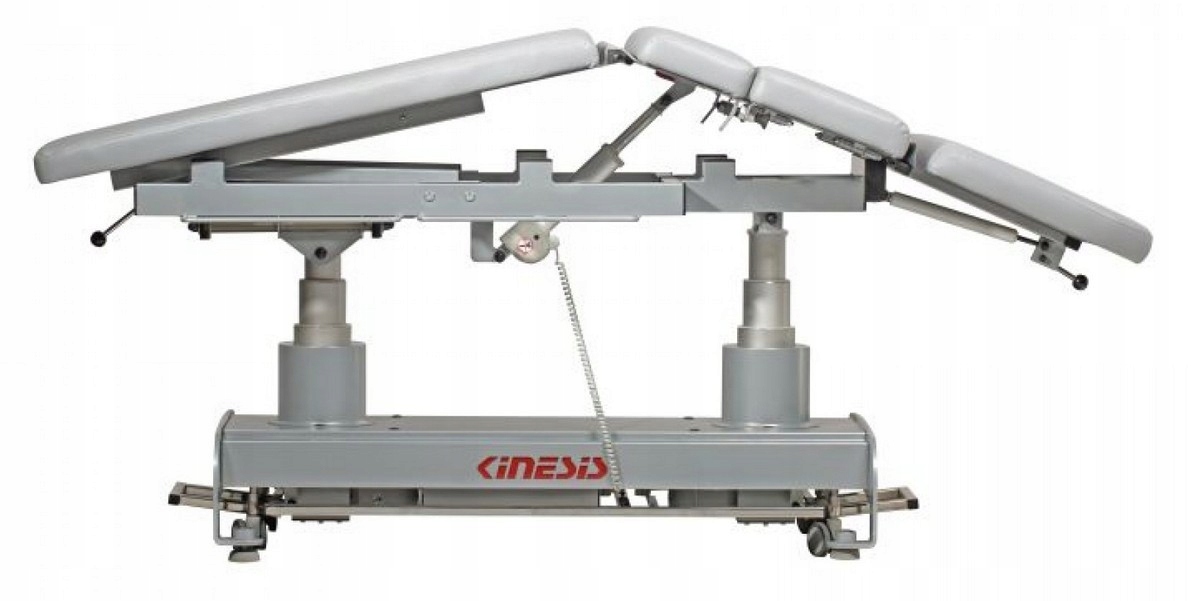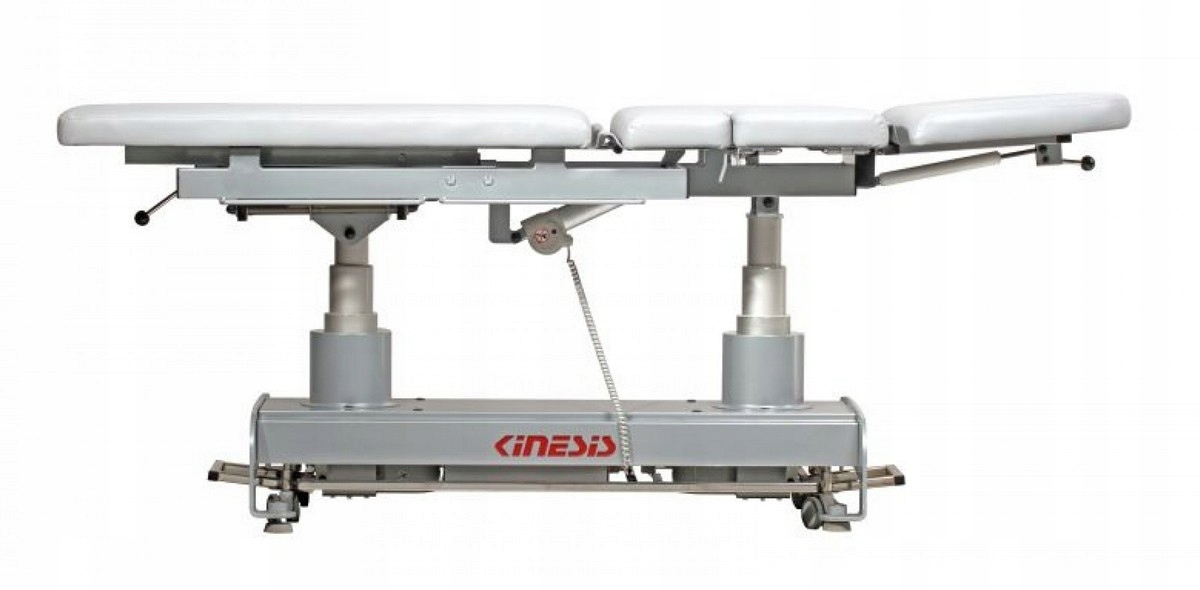 таблиця реабілітації Ідеальна III 3-частина з зміною висоти електричного листя за допомогою рами навколо столу, виготовленої з порошкоподібних сталевих профілів. Три -створення трьох -порівня дозволяє різному розміщенню пацієнта на стільниці, в положенні, що лежить, лежачи та лежачи. Таблиця має поздовжнє регулювання нахилу Тренделенбурга та анти-Тренделенбург на стовпцях з ручним дистанційним керуванням. Встановлення підголівника та задньої частини в сидячому положенні підтримуються газовими пружинами. Положення повороту регулюється з циліндром, розміщеним у верхній частині столу. Армреслери покинули механічно. Оснащений стабілізаційними ременями для монтажних ручок та транспортними колесами. технічні дані: