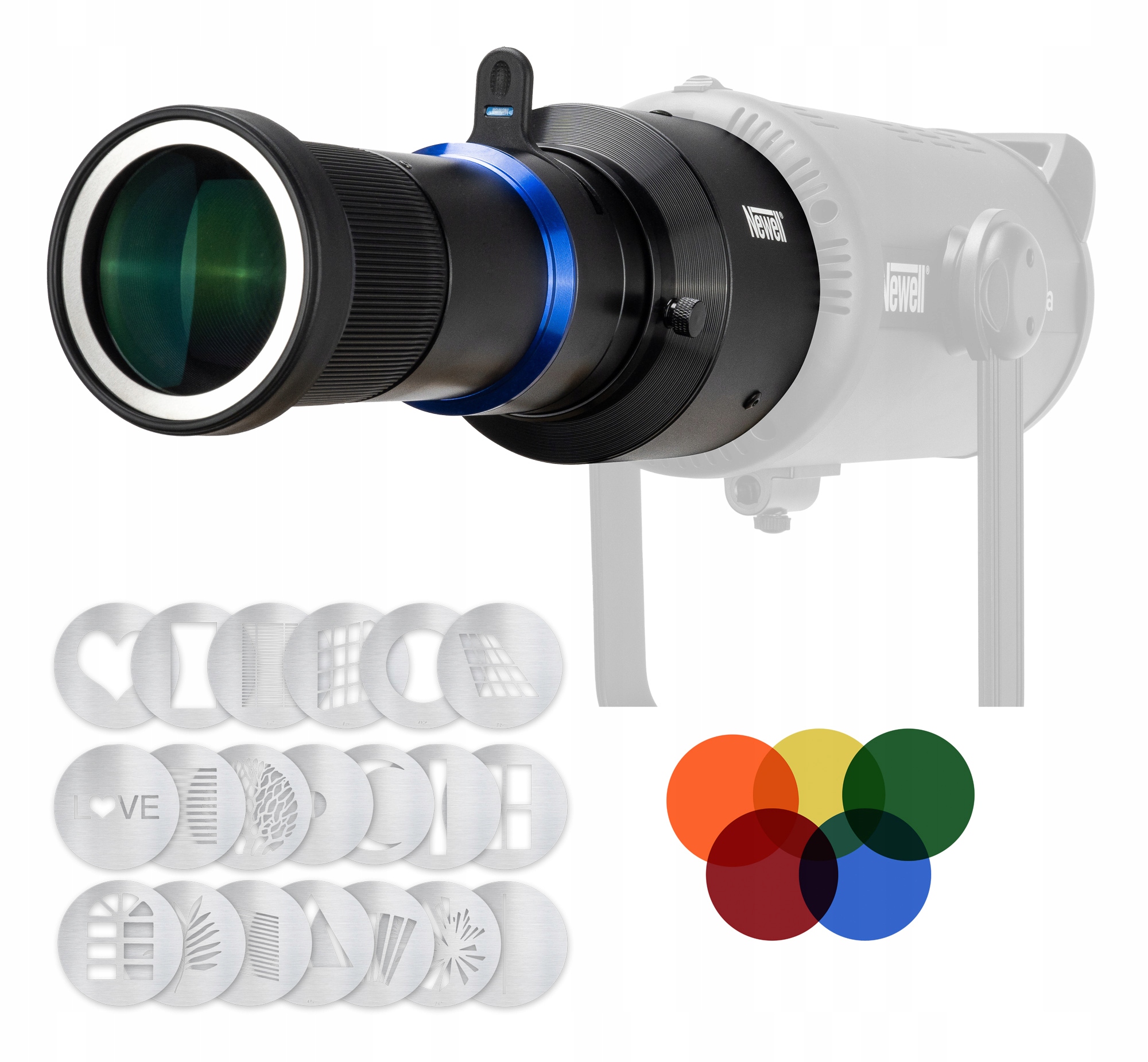 Оптичний промінь Newell Perseo-33 — це універсальний інструмент для точного формування світлового променя, який використовується у фотографії та кіно. Оснащений кріпленням Bowens, він сумісний з широким спектром ламп, що дозволяє легко створювати світлові ефекти. У набір входить 20 фільтрів GOBO і 5 ефектних фольг, які дозволяють створювати унікальні візерунки і кольори світла. Магнітне кріплення дозволяє швидко і без проблем замінити. Кільце фокусування забезпечує точне налаштування світлового потоку під поточні потреби. Висока якість виготовлення та 40-місячна гарантія роблять цей струмінь надійним вибором для професіоналів.