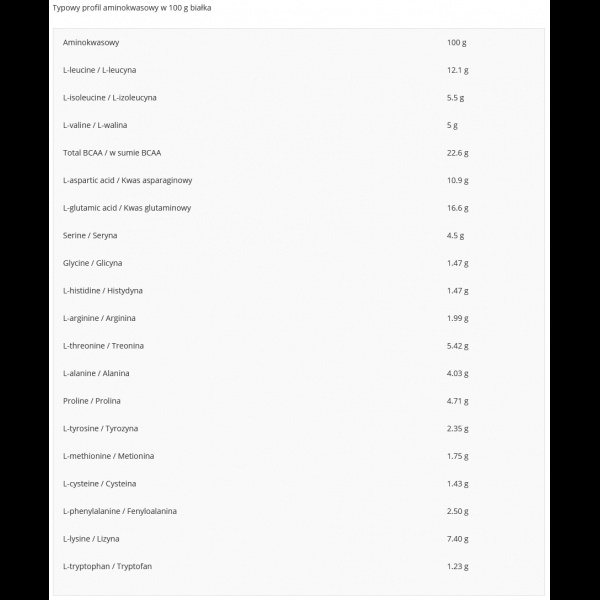 Харчова цінність Інгредієнт 100 г 90 г 60 г 30 г Енергетична цінність 1497 кДж / 352 ккал 1347 кДж / 317 ккал 898 кДж / 211 ккал 449 кДж / 106 ккал Жир 0,3 г 0,27 г 0,18 г 0,09 г включаючи насичені жирні кислоти 0,05 г 0,05 г 0,03 г 0,02 г вуглеводи 1 г 0,9 г 0,6 г 0,3 г в тому числі цукру 1 г 0,9 г 0,6 г 0,3 г клітковина 0,8 г 0,72 г 0,48 г 0,24 г білок 86 г 77,4 г 51,6 г 25,8 г сіль 0,5 г 0,45 г 0,3 г 0,15 г Амінокислотний профіль Амінокислота 100г L-лейцин 12,1 г L-ізолейцин 5,5 г L-валін 5 г Загалом, BCAA 22,6 г Аспарагінова кислота 10,9 г Глутамінова кислота 16,6 г серин 4,5 г гліцин 1,47 г Гістидин 1,47 г Аргінін 1,99 г Треонін 5,42 г Аланін 4,03 г Пролін 4,71 г Тирозин 2,35 г метіонін 1,75 г цистеїн 1,43 г Фенілаланін 2,50 г Лізин 7,40 г Триптофан 1,23 г Інгредієнти