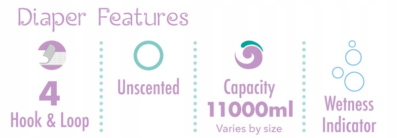 Тепер із чотирма великими подвійними липкими стрічками замість посадкової зони, щоб знову добре упакувати підгузок, дуже високий рівень захисту -стінки протікання довжиною приблизно 5,5 см.
