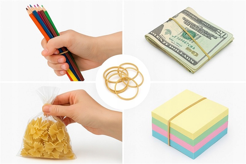 гумові гумки мають багато додатків - від промисловості, через офісну роботу, моделювання, банківство, садівництво, архівування документів, до повсякденного життя. Вони набагато корисніші, ніж клейова стрічка, струна чи інші кріплення. Еризер рецептів буде незамінним аксесуаром, де ми хочемо швидко, легко та ефективно прикріпити деякі товари.