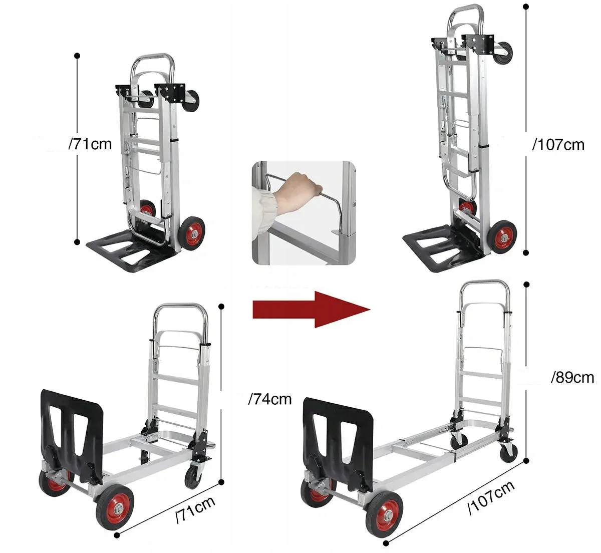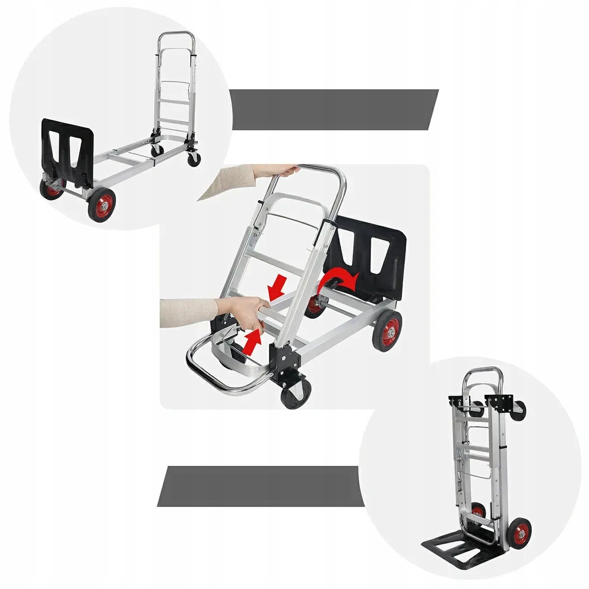 Ви коли -небудь опинилися в ситуації, коли вам потрібно перевезти важкий навантаження, але у вас немає правильного обладнання? Ми знаємо це почуття ідеально, саме тому ми створили цю коляску "Складний 2 в 1", яку можна швидко перетворити з двох -колеса на чотириколісну горизонтальну коляску, щоб полегшити ваше життя! Цей складний візок з колесами допоможе вам транспортувати важкі предмети, дошки, інструменти для садівництва, валізи або офісні товари. Його компактні розміри полегшують транспорт та зберігання в багажнику. Буде ідеальним маленьким помічником у житті.