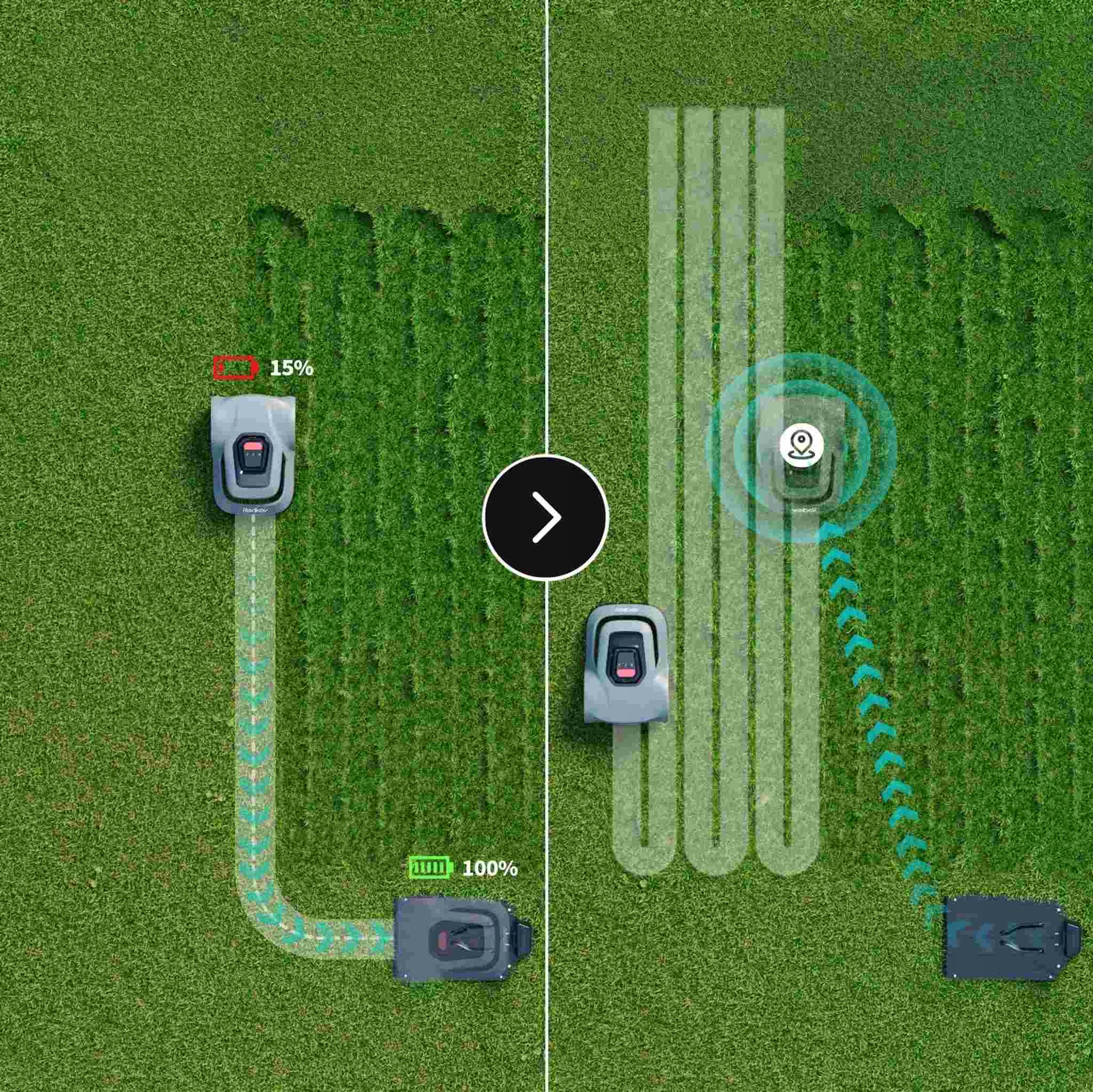 Наші газонокосарки оснащено великими акумуляторами, які забезпечують 70 хвилин активного часу косіння на одному заряді. Пристрій автоматично повертається до зарядної станції, коли рівень заряду батареї падає нижче 15%, і відновлює роботу, коли рівень заряду досягає 90%. Автоматично повертається до зарядної станції в дощові дні