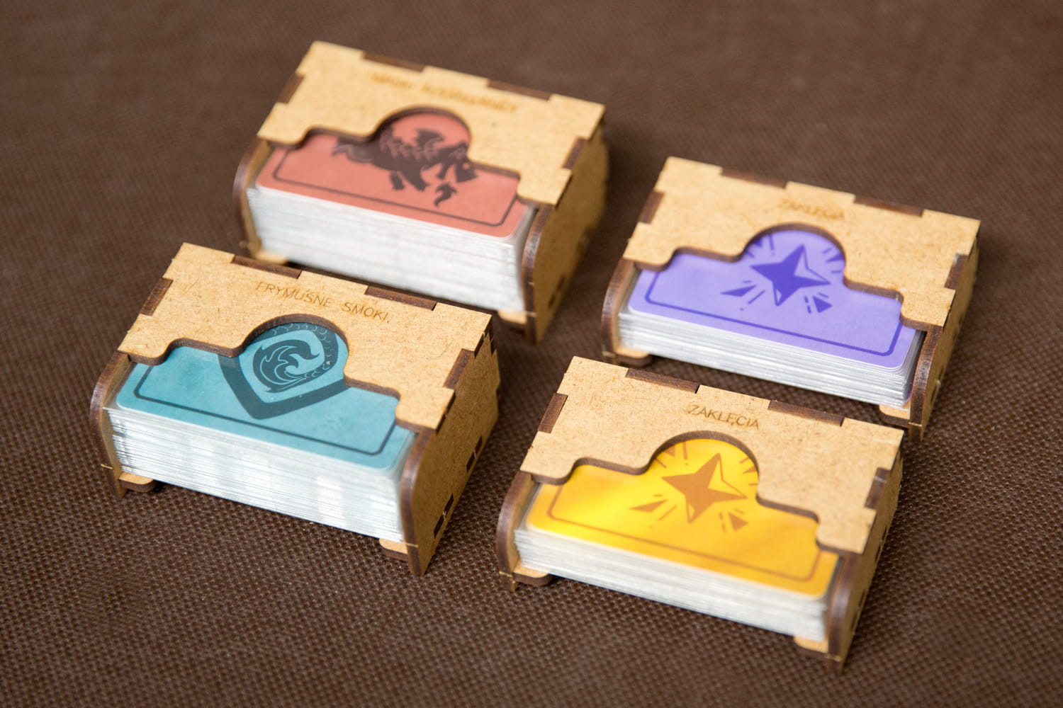 - Контейнери для карток поділяються за типом, крім того, маленькі контейнери для карток служать диспенсерами для карток Драконів, Заклиначів, Фанзі Драконів