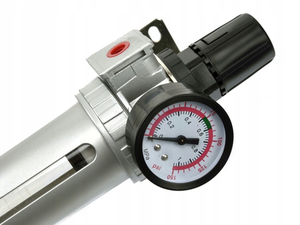 Редуктор з повітряним фільтром і мастилом. Редуктор з манометром забезпечує точне регулювання робочого тиску повітря до 10 бар. Він використовується, серед іншого, для підтримки постійного робочого тиску, необхідного для правильної роботи. фарбувальні пістолети, ударні гайковерти, шліфувальні машини тощо