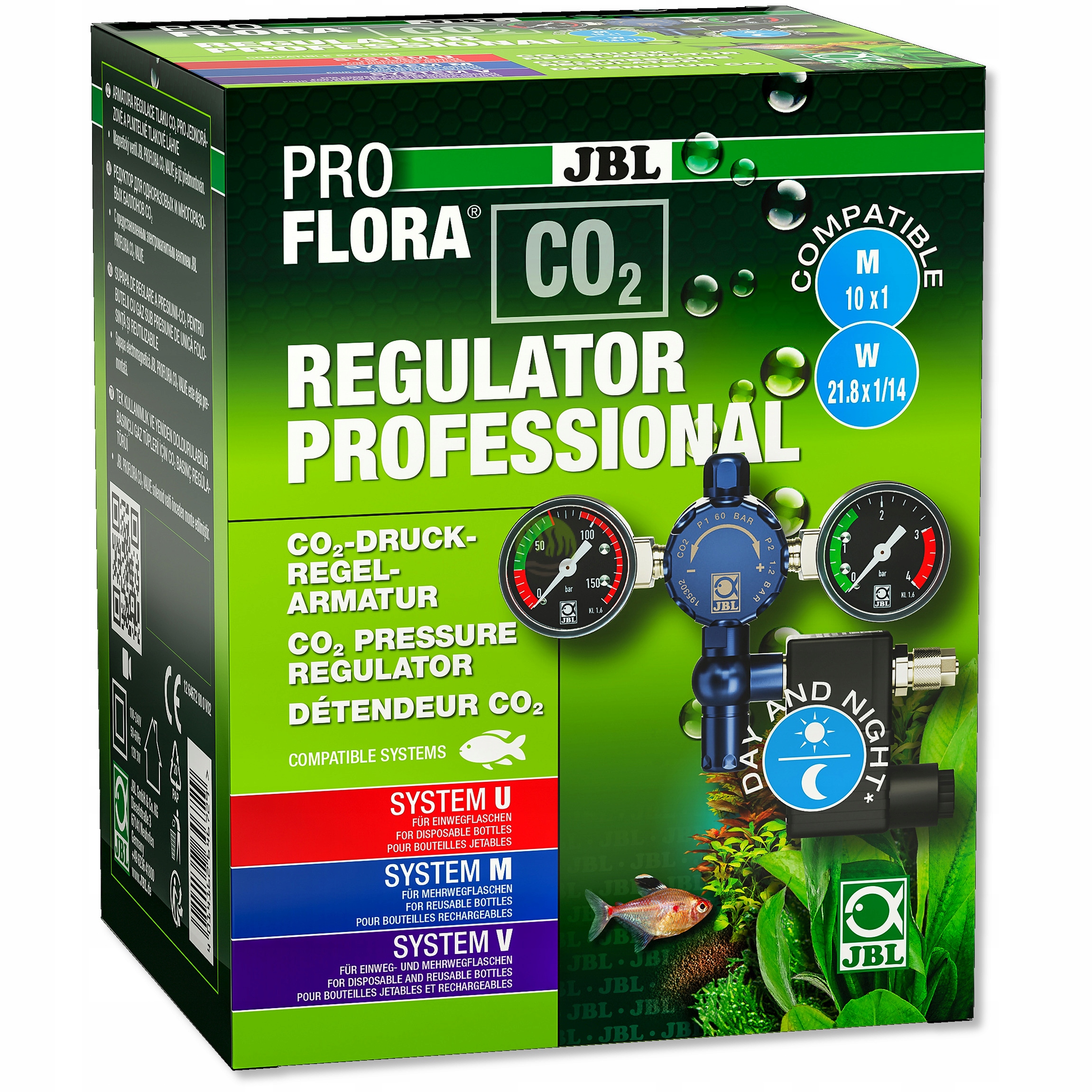 - Нічне вимикання/контроль CO2: магнітний клапан можна ввімкнути за допомогою таймера (не входить до комплекту), щоб увімкнути світло та CO2 вранці (знову вимкнути ввечері), або магнітний клапан вмикається та вимикається за допомогою контролера CO2 (JBL PROFLORA CO2 CONTROL), щоб контролювати подачу CO2 і таким чином автоматично регулювати значення. pH.