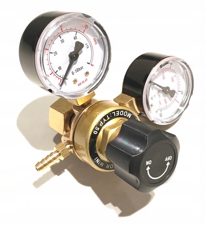 Редуктор міні-типу, має 2 годинники. Перший показує тиск в балоні, другий показує тиск на виході. При використанні в диспенсерах газованої води найважливішим є редуктор, який показує тиск у балоні, щоб ви знали, коли газ закінчиться.