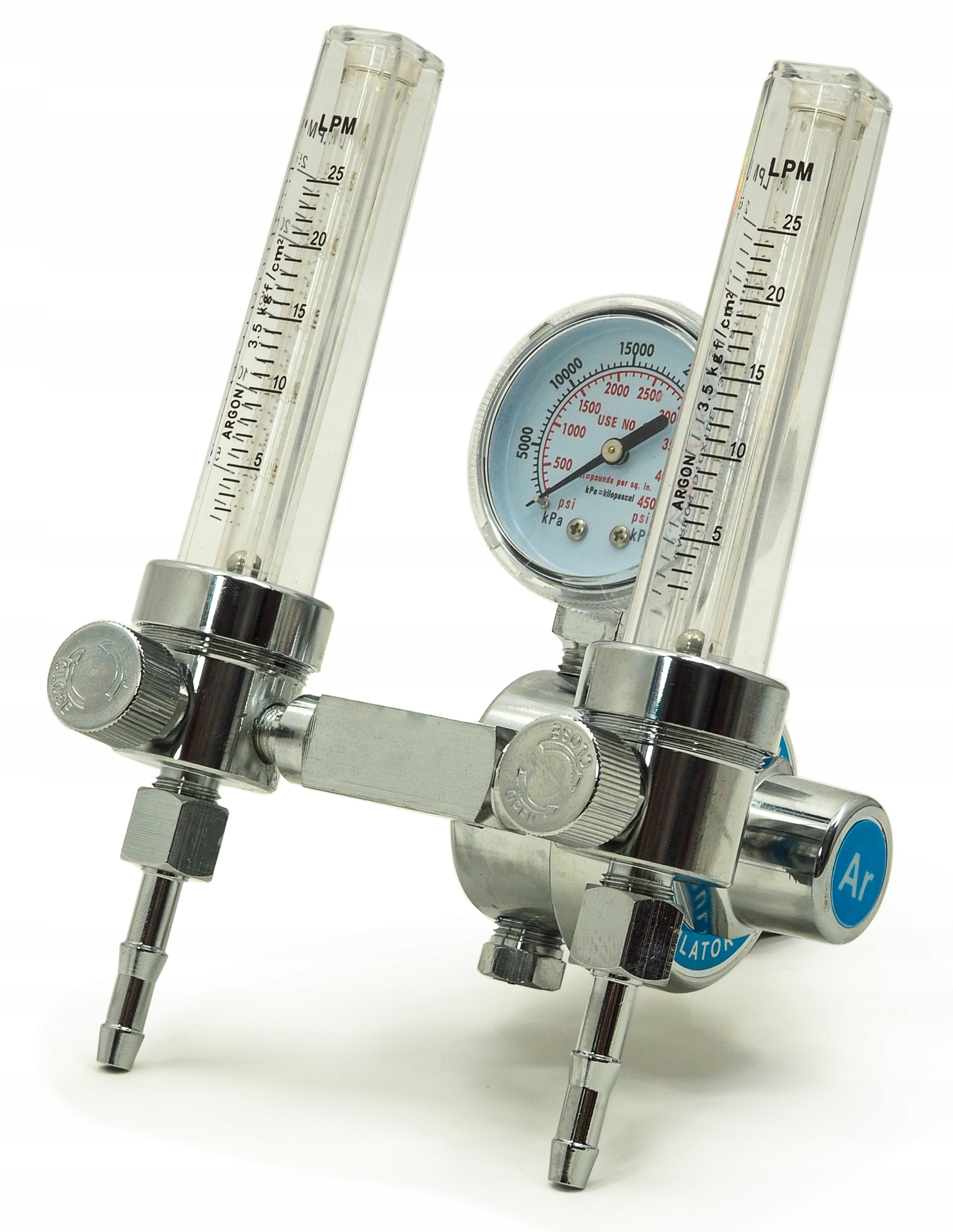 Циліндровий регулятор із двома ротаметрами для аргону та СО2 — безважільний регулятор зі змінним регулюванням тиску на виході. Він дозволяє знизити робочий тиск і гарантує, що цей тиск автоматично підтримується настільки постійним, наскільки це можливо, незалежно від тиску на вході. Редуктор оснащений запобіжним клапаном, через який, коли тиск на виході перевищує допустиму межу, надлишковий газ випускається з камери вихідного тиску назовні.