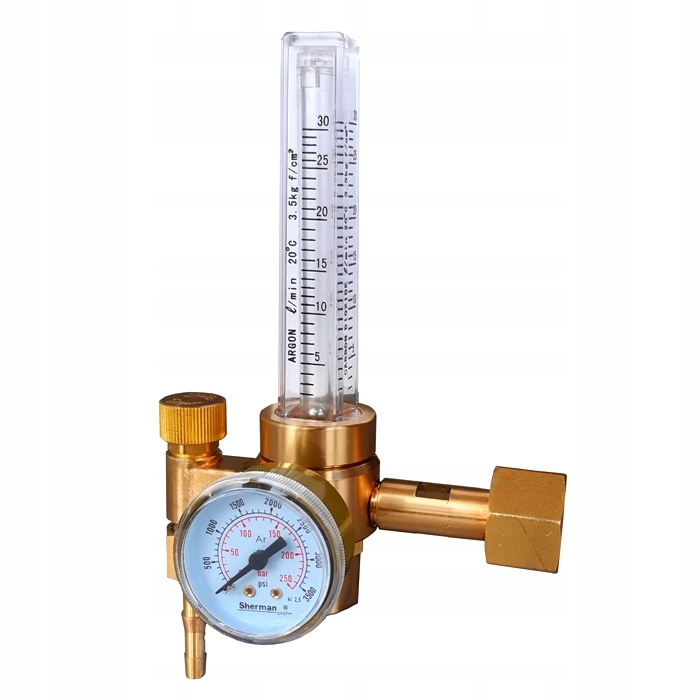 Редуктор аргону та вуглекислого газу SHERMAN CO2/Ar RBR-CO2. Оснащений одним ротаметром. Корпус і роз'єм виготовлені з латуні. Одноступінчасті регулятори балона призначені для зниження і регулювання тиску газу, що відбирається з балона, і автоматичного підтримання на постійному рівні певного вихідного (робочого) тиску.