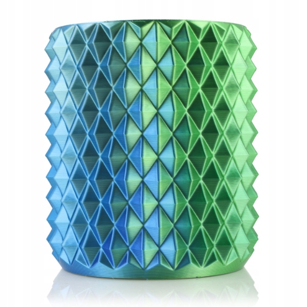 PLA Magic Silk– це нитка для 3D-друку, розроблена на основі PLA-Silk. Чим він виділяється? Це паралельне поєднання двох кольорів в одній нитці, досягнуте завдяки процесу коекструзії. Готові 3D-принти виблискують фарбами, створюючи «чарівні» візуальні ефекти. Найбільш ефектно виглядають відбитки 3D моделей зі складною нерівною структурою з численними деталями.