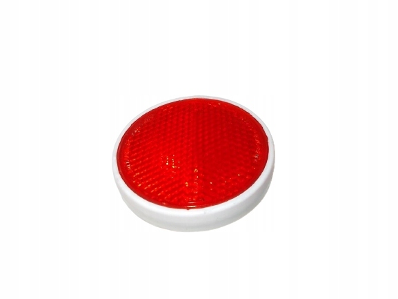 Новийрефлектор червоний з білою рамкою 90мм. Виробник: Spółdzielnia Inwalidów Solidarność Grudziądz. По периметру рефлектора на елемент нанесено назву виробника. Ззаду є центральний кріпильний гвинт. Ціна за 1шт Оригінал епохи.