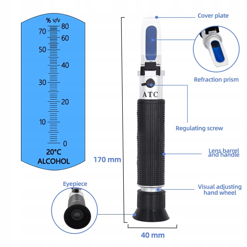 Рефрактометр - це спеціальний прилад, який дозволяє з мінімальною похибкою одночасно визначити вміст алкоголю і цукру у вині, пиві або самогоні. Показання приладу базуються на дослідженні показника заломлення світла (зміна напрямку заломлення світла після взяття проби на призму рефрактометра).