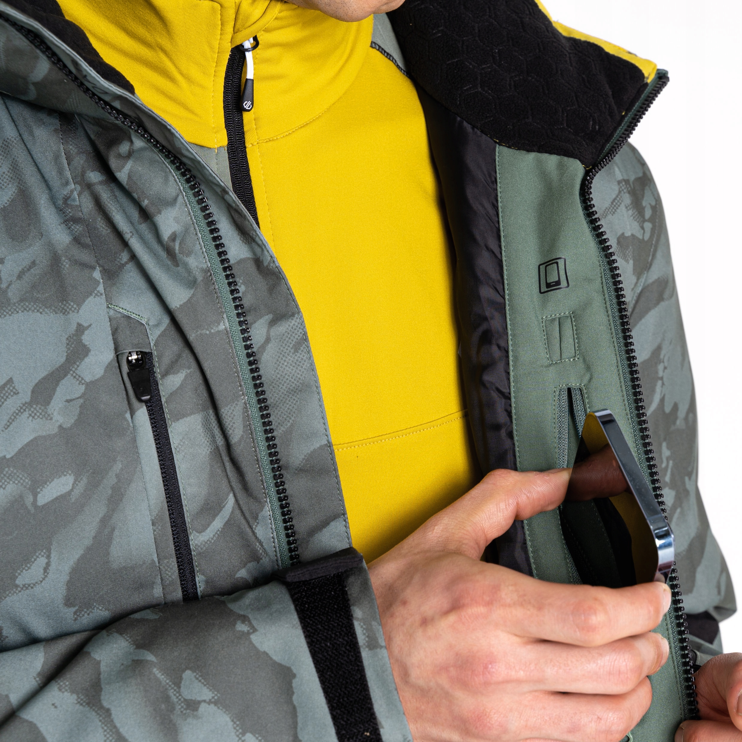 Кишені: дві спереду на блискавці. Один на грудях, один на рукаві для скі-пасу. Два внутрішніх один з сітки з серветкою для протирання окулярів, інший на блискавці для телефону.