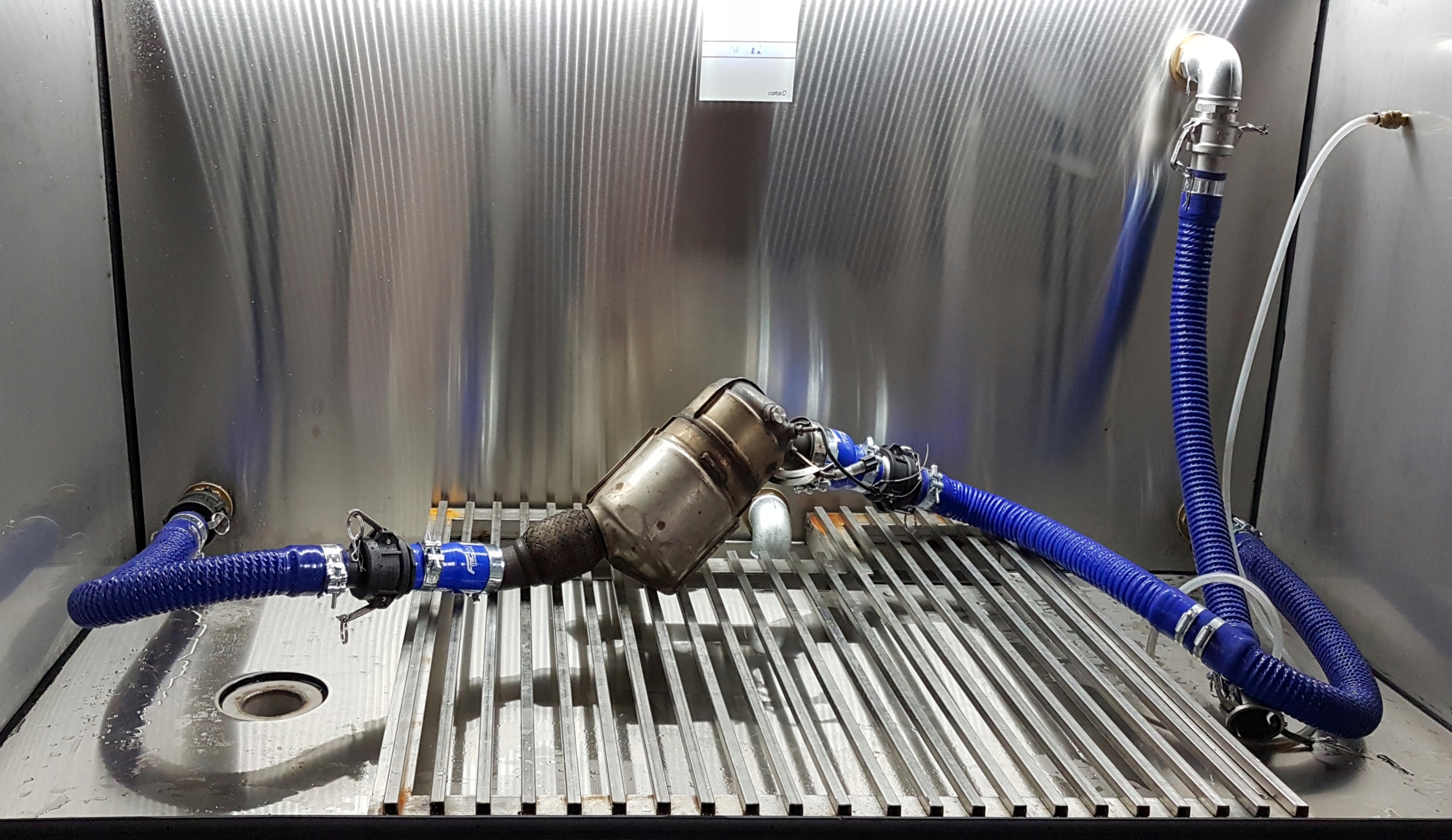 Очищення здійснюється гідродинамічною системою очищення фільтра DPF. Цей метод більш ефективний і менш ризикований, ніж ультразвукова чистка. Це пов’язано з тим, що вставка фільтра виготовлена з карбіду кремнію, який може бути розчавлений під час використання ультразвуку.