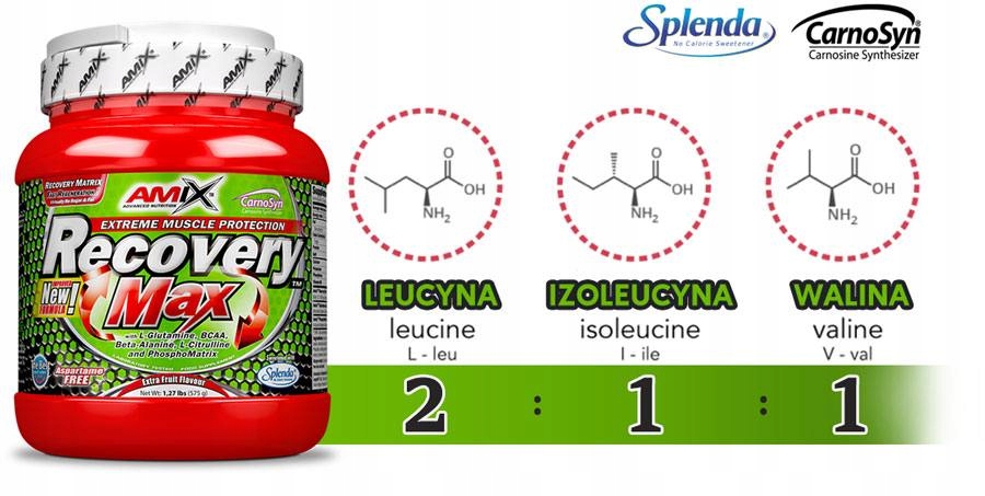 Основним елементом Recovery Max є BCAA, тобто амінокислоти з розгалуженим ланцюгом (лейцин, ізолейцин, валін), які необхідні для життєдіяльності та повноцінної роботи та розвитку м'язів. Amix Recovery Matrixмістить BCAA у співвідношенні 2:1:1, що сприяє доступності анаболічного лейцину. Дія BCAA заснована на стимуляції синтезу м'язового білка, особливо за участю лейцину. Це відповідає за активацію білка, відомого як mTOR, який індукує синтез м’язового білка через фермент протеїнкіназу S6K. Цей процес необхідний для правильної регенерації м'язів і нарощування їх маси. Плюс