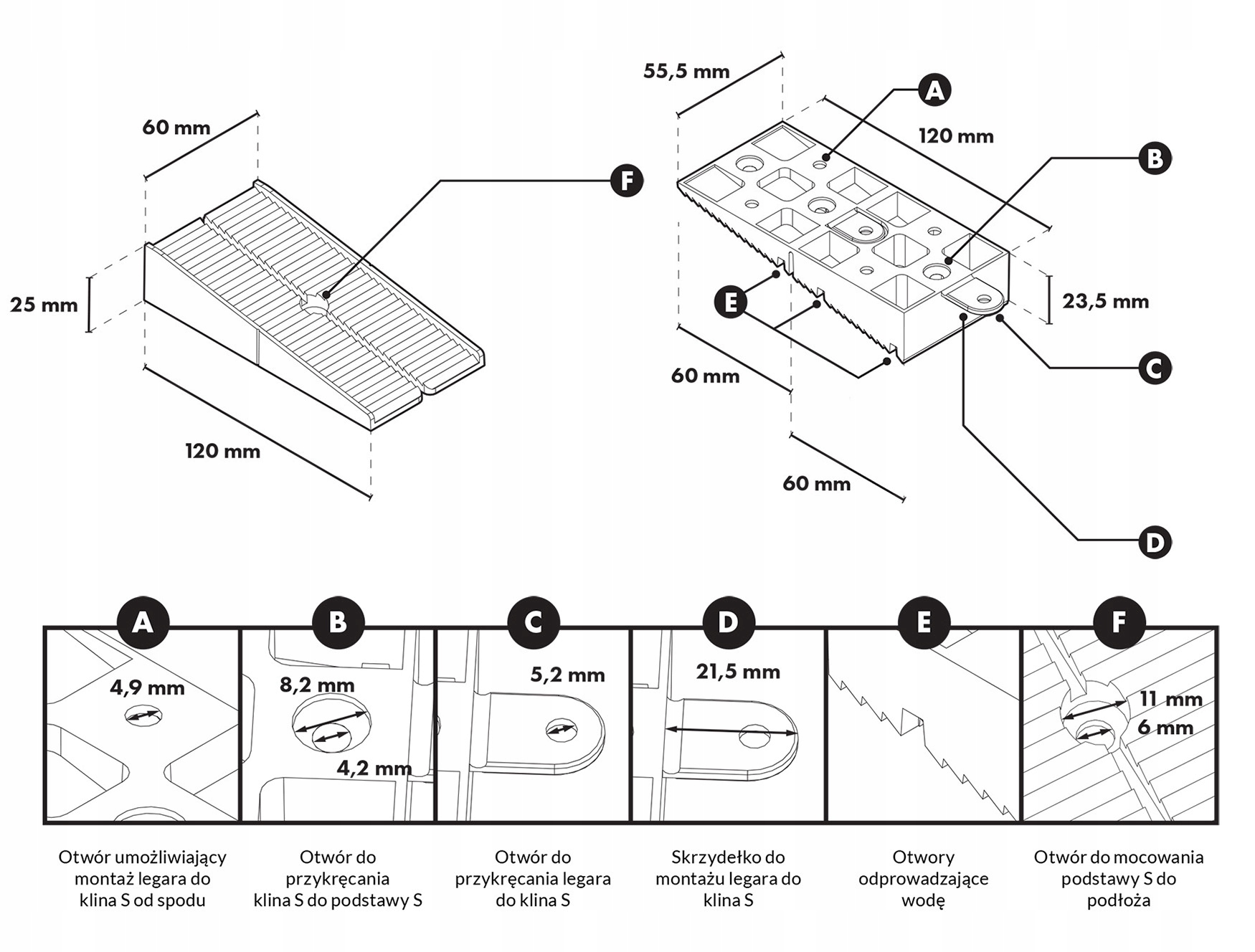 S клин: Зовнішні розміри: ширина: 55,5 мм, довжина: 120 мм, висота: 23,5 мм. S-основа: зовнішні розміри: ширина: 60 мм, довжина: 120 мм, висота: 25 мм