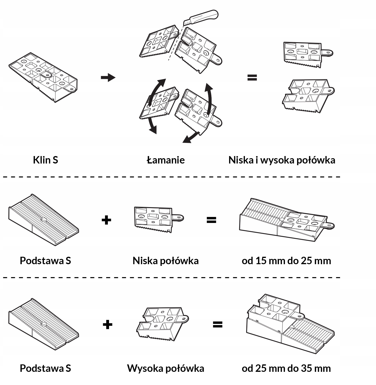 Примітка: необхідно зменшити клин навпіл, щоб отримати діапазон регулювання 15 мм. Комплекти з напівклинів і S-основи можна комбінувати з додатковими аксесуарами, захисною накладкою 2 мм, коректором нахилу, акустичною накладкою і підставкою 30 мм.