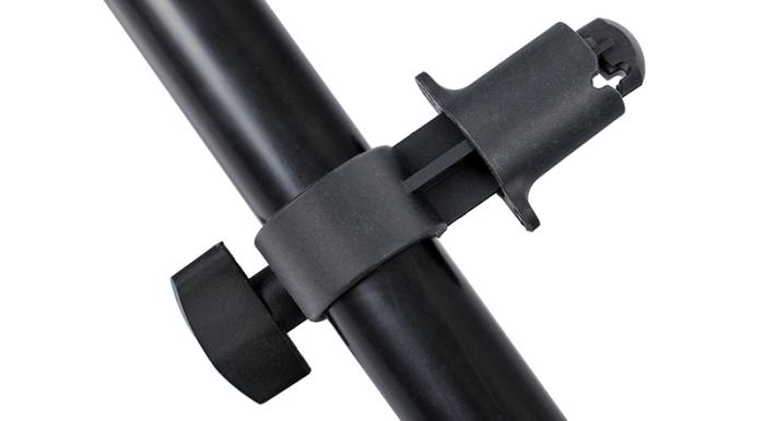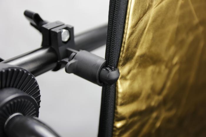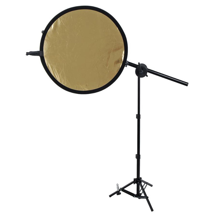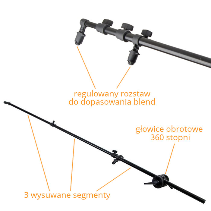 Міцна та міцна ручка для кріплення сумішей. Дуже корисно, коли ви не можете самостійно тримати блендер. Відбивач, встановлений на ручці, можна встановити в будь-якому положенні і під будь-яким кутом. Тримач має регульовану котушку, яка дозволяє прикріпити відбивач до підставок для освітлення та дозволяє обертати промінь, що утримує блендер, на 360 градусів. Ця функція дозволяє вам вільно встановіть кут, під яким буде спиратися блендер. Плавне регулювання довжини променя дозволяє встановити жалюзі різного діаметру, від менших з діагоналлю 74 см до великих жалюзі з діагоналлю 172 см. Щоб все було стабільно, використовуйте тримач із міцним штативом (підходить до підставок для освітлення, які ми продаємо: w806)