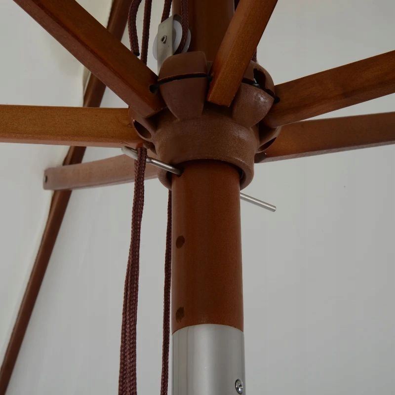 Велика парасолька від сонця ідеально підходить для пляжу, саду та балкона. Ідеально захищає від сонця, створюючи заспокійливу тінь. Стійкість парасольки забезпечують металеві опори. Дерев'яна жердина, що складається з двох частин, забезпечує велику стійкість парасольки, а також регулюється. Парасолька виготовлена з водостійкого поліефірного матеріалу. Крім того, він захищає від сильного ультрафіолетового випромінювання.