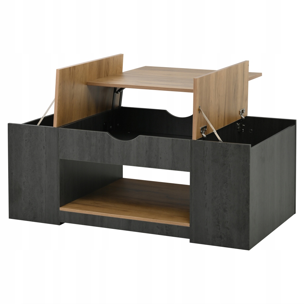 Стіл оснащений механізмом гідравлічного регулювання висоти, який не тільки практичний, але коли його підняти, він також відкриває приховане місце для зберігання. Невеликі панелі з обох сторін можна відкрити, щоб отримати додатковий простір для зберігання. Розумна конструкція з вбудованим дизайном забезпечує легкий доступ до всіх отворів.