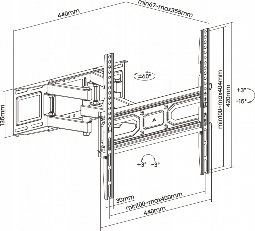 - Регулювання кута нахилу (по вертикалі): + 3 / -15 градусів