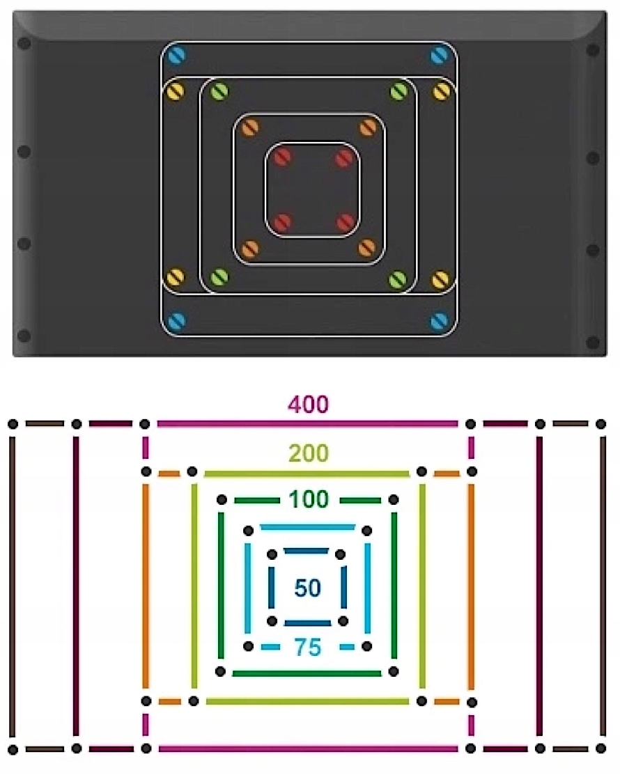 - VESA: 100x100, 100x200, 200x200, 300x300 .... . 600x400