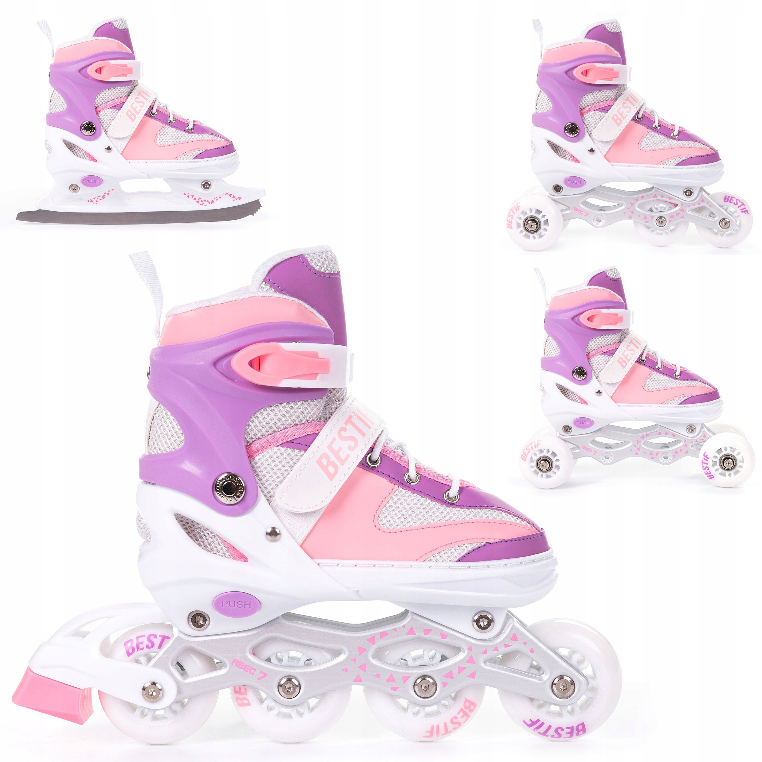 Завдяки системі 4в1ви можете насолоджуватися цим продуктом цілий рік . У будь-який час ви можете змінити розташування коліс з роликових ковзанів на роликові ковзани або роликові ковзани. Крім того, у набір входить бігунка, що дозволяє використовувати виріб навіть взимку.