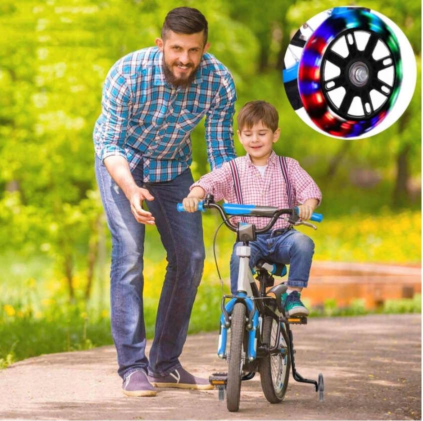 - Індикатори тренувальних колес горітимуть під час їзди, роблячи вашу дитину більш помітною та безпечною вночі чи в темряві. Крім того, класний дизайн підсвічування зацікавить дітей навчитися їздити на велосипеді.