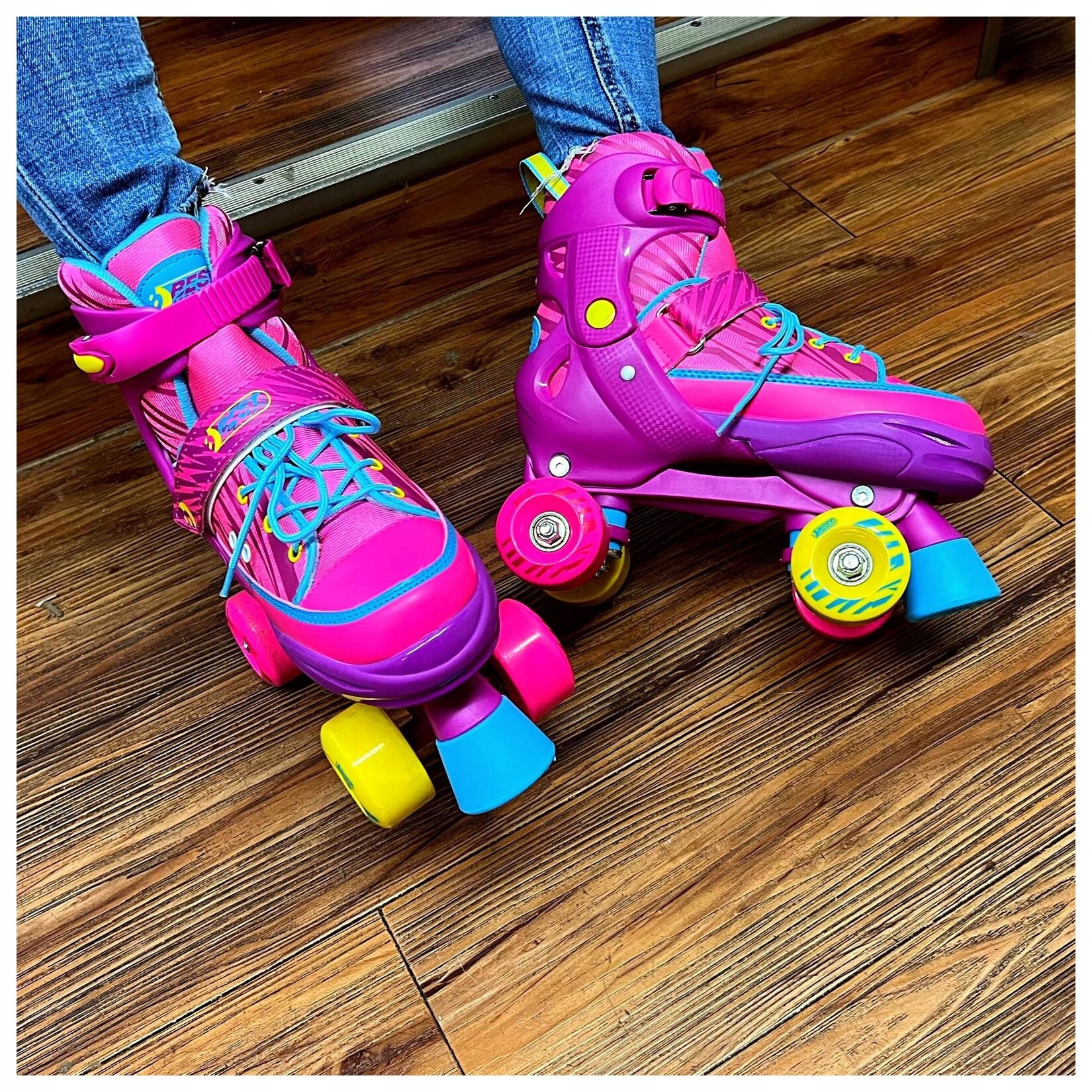 Симпатичні рожево-фіолетові роликові ковзани з різнокольоровими кілочками!!