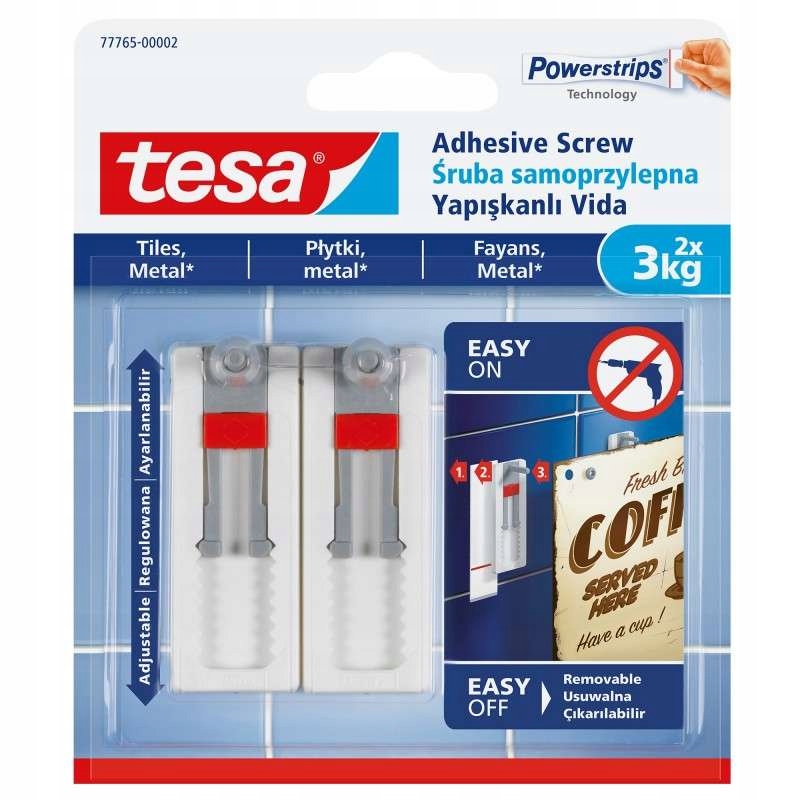 Самоклеючий практичний монтажний гвинт tesa® із вертикальним регулюванням висоти дозволяє рівномірно та просто встановлювати без свердління чи прибивання цвяхів. Спеціальна конструкція дозволяє кріпити відразу два гвинти, що вдвічі збільшує вантажопідйомність з 3 до 6 кг. Крім того, завдяки патчам Powerstrips® гвинт можна використовувати багаторазово. Просто купіть коробку нових патчів. Це, безсумнівно, чудовий спосіб заощадити час і енергію.