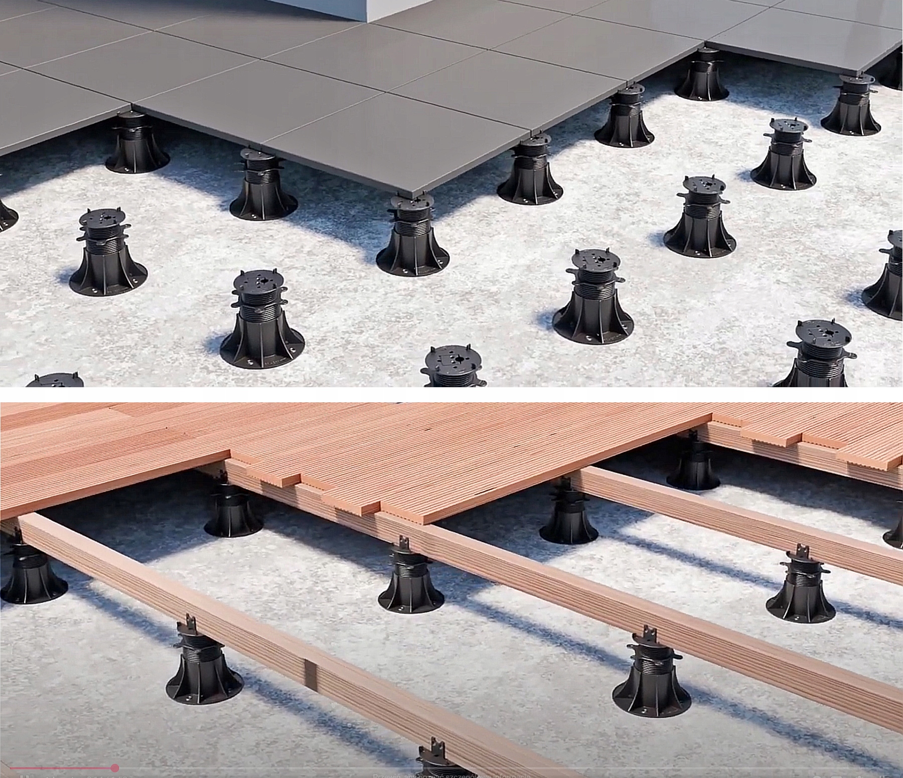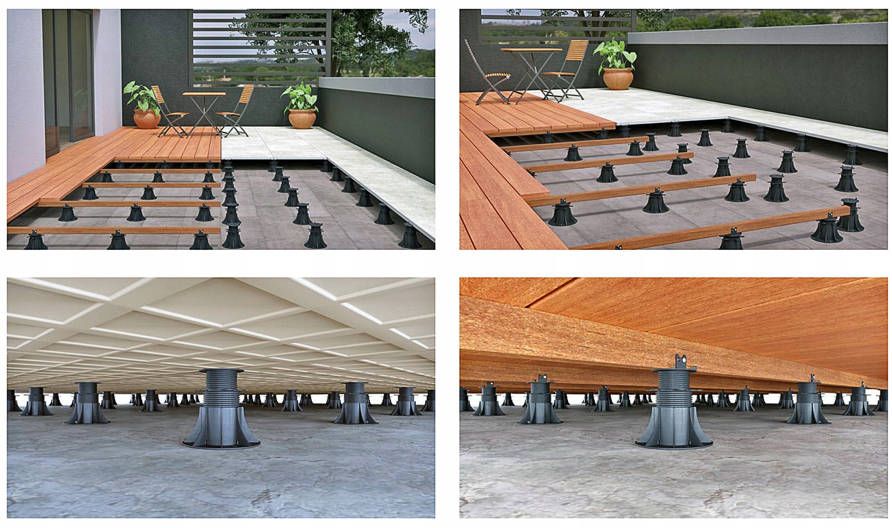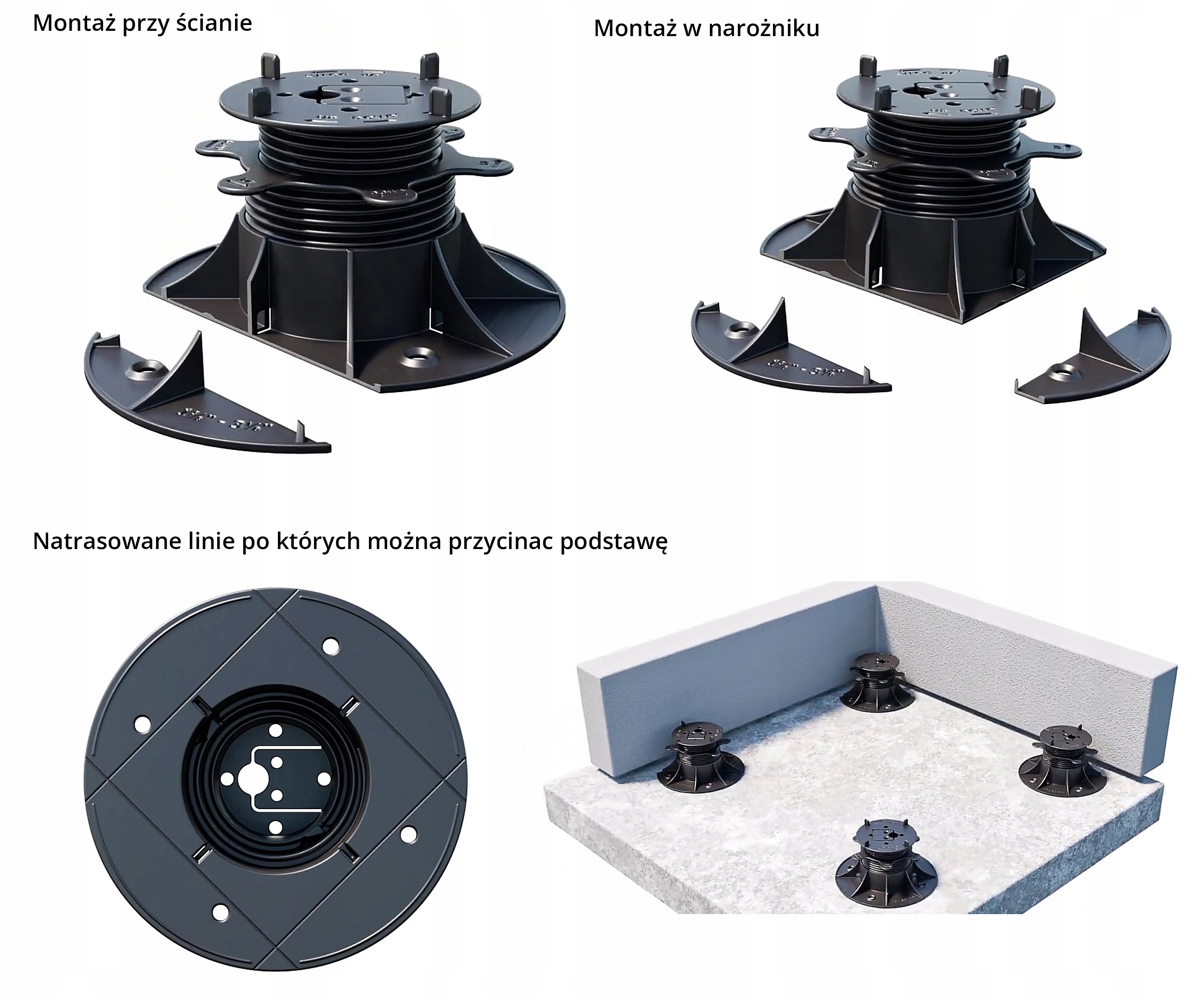 Регульовані опори серії розумних рівнів є універсальним рішенням для використання в піднятих терасах , що вентильоване. Дозволяє налаштувати висоту від 25 мм до 200 мм. Можна плавно відрегулювати висоту кронштейнів за допомогою обертової гайки, навіть коли тераса вже встановлена на дужках. можна використовувати як з пластинами (побудовані відстані мопса шириною 3 мм) , так і лагівки (вбудований елемент для фіксації законодавства). Кронштейни забезпечують міцну підтримку і можуть використовуватися на більшості типів підкладки, включаючи підкладки з гідроізоляцією. Використання кронштейнів серії розумних рівнів не потребує додаткових аксесуарів при встановленні терас з дисків або на леках.